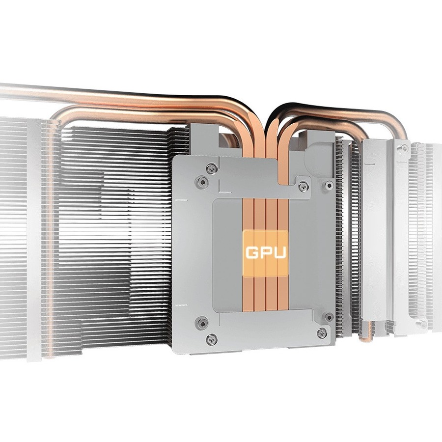 The shape of the pure copper heat pipe maximizes the direct contact area with the GPU. The heat pipe also covers the VRAM through a large metal plate contact to ensure proper cooling.
