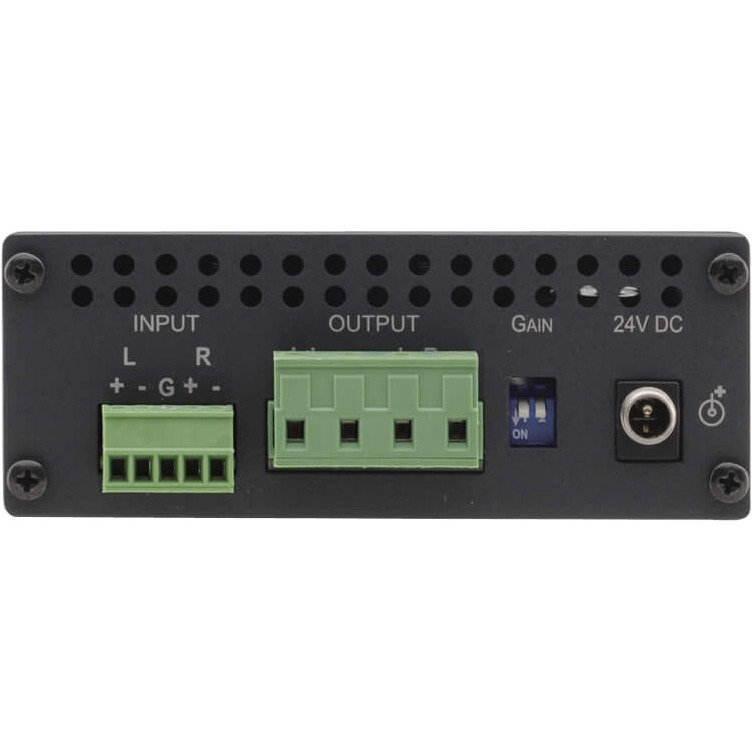 The 907 is a high-performance power amplifier for line-level stereo audio signals. It accepts a balanced stereo audio signal on a terminal block connector and delivers 40 watts per channel into an 8Ω load.