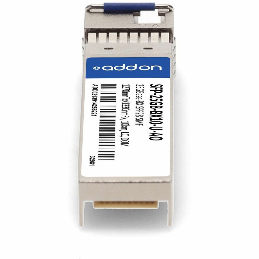 This MSA and TAA compliant SFP28 transceiver provides 25GBase-BX throughput up to 10km over single-mode fiber (SMF) using a wavelength of 1270nmTx/1330nmRx via an LC connector. This bidirectional unit must be used with another transceiver or network appliance of complementing wavelengths. It is guaranteed to be 100% compatible with the equivalent MSA compliant® transceiver. This easy to install, hot swappable transceiver has been programmed, uniquely serialized and data-traffic and application tested to ensure that it will initialize and perform identically. Digital optical monitoring (DOM) support is also present to allow access to real-time operating parameters. This transceiver is Trade Agreements Act (TAA) compliant. We stand behind the quality of our products and proudly offer a limited lifetime warranty.