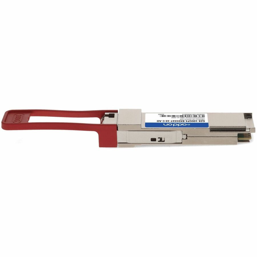 This Cisco® compatible QSFP28 transceiver provides 100GBase-BX throughput up to 10km over single-mode fiber (SMF) using wavelengths of 1331nmTx/1271nmRx via an LC connector. It is guaranteed to be 100% compatible with the equivalent Cisco® transceiver. This easy to install, hot swappable transceiver has been programmed, uniquely serialized and data-traffic and application tested to ensure that it will initialize and perform identically. Digital optical monitoring (DOM) support is also present to allow access to real-time operating parameters. This transceiver is Trade Agreements Act (TAA) compliant. We stand behind the quality of our products and proudly offer a limited lifetime warranty.