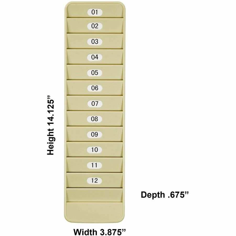 The 500-12 employee badge rack keeps swipe cards, badges and other items readily accessible. Install next to time clocks or in entry areas. Holds 12 standard size employee ID cards, swipe cards and proximity badges. Install two racks side by side to visually monitor employee In/Out attendance. Includes self-adhesive number labels for assigning card slots to employees. Lightweight, durable plastic. Putty.