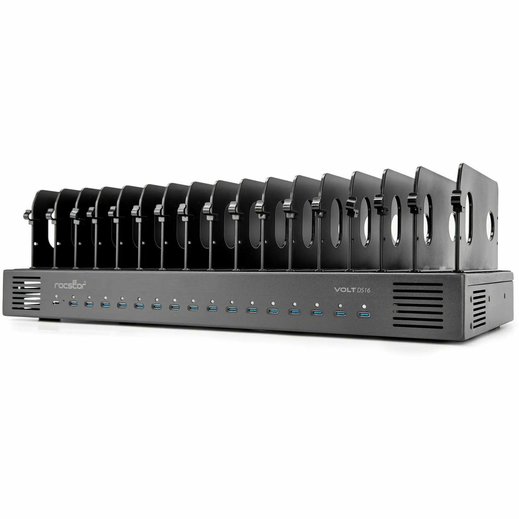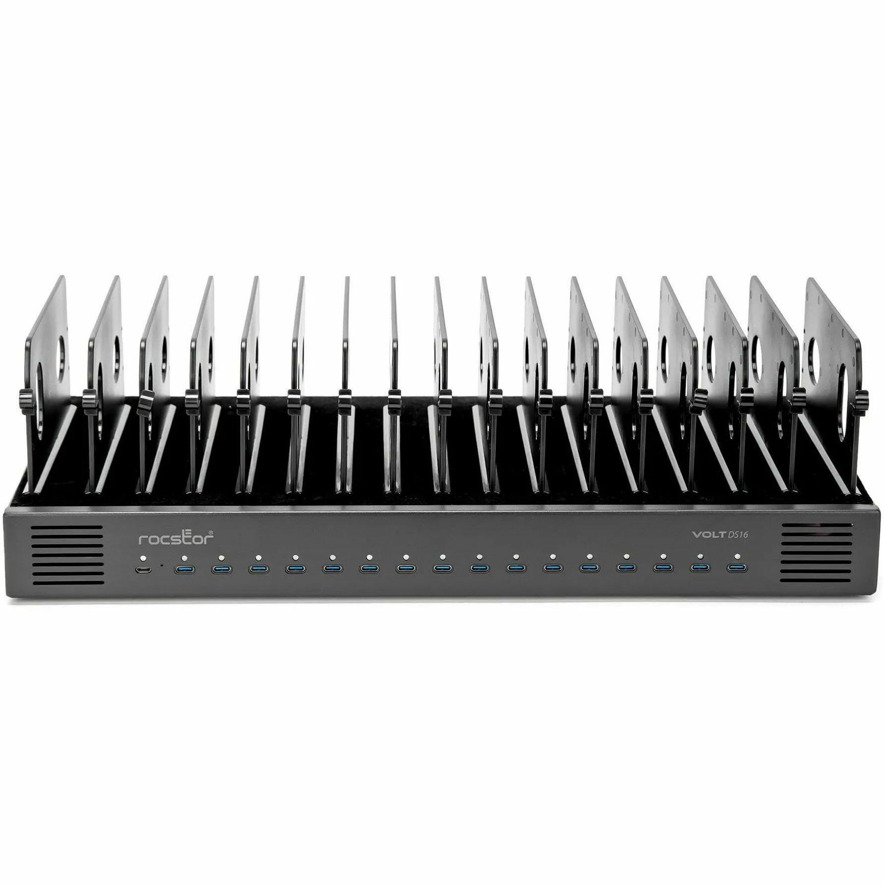 The design of the Volt DSC16 emphasizes user convenience and operational efficiency. It features a unique top-loading structure with 16 divided slots that allow for easy access and quick connection. The USB-C™ ports are strategically placed at the front of the station, simplifying the process of plugging in and removing devices. This is further enhanced by Rocstor's included custom USB-C™ cables equipped with LED indicators, which show red for charging and green when fully charged, providing a clear visual status that optimizes workflow and minimizes downtime.