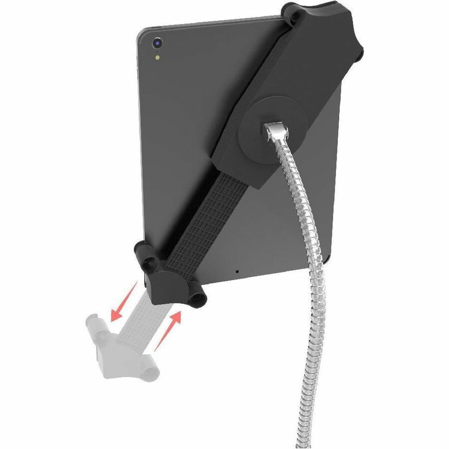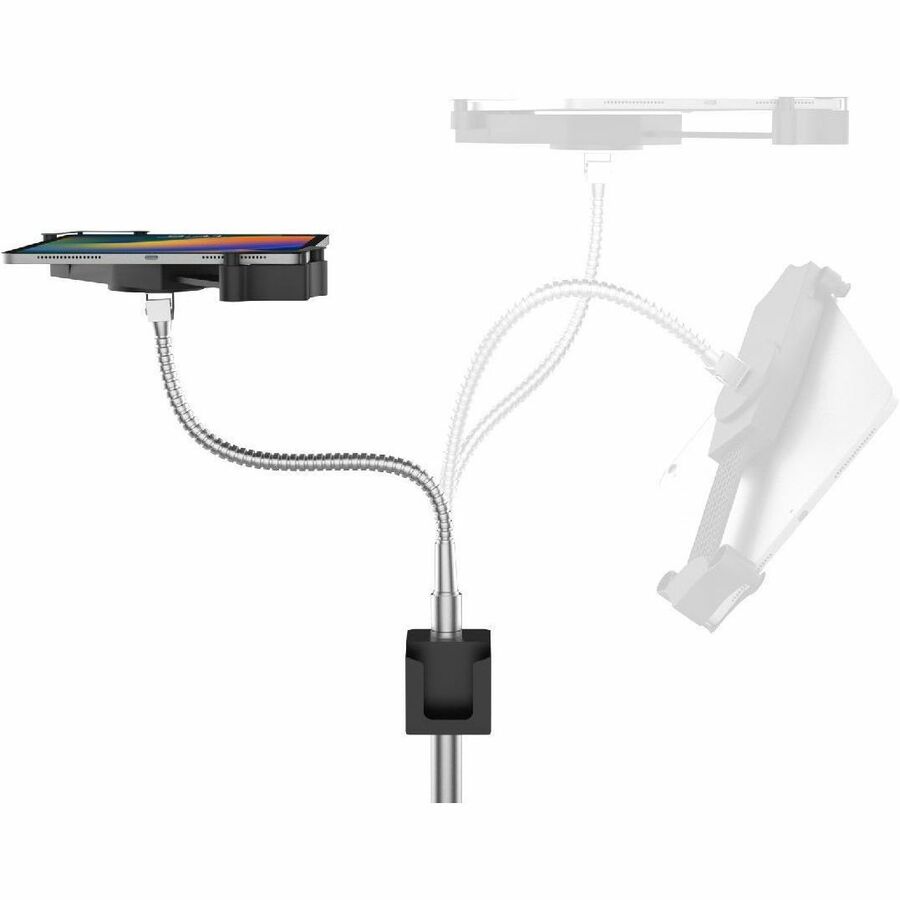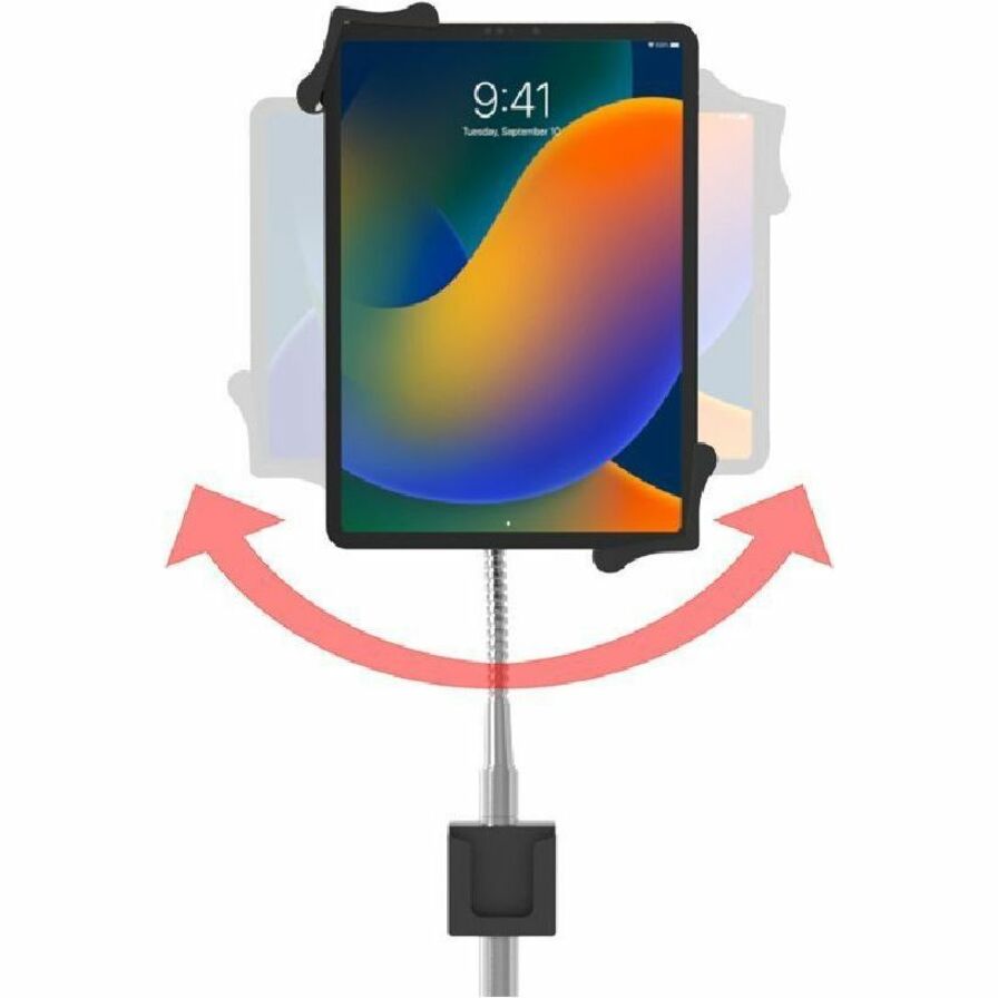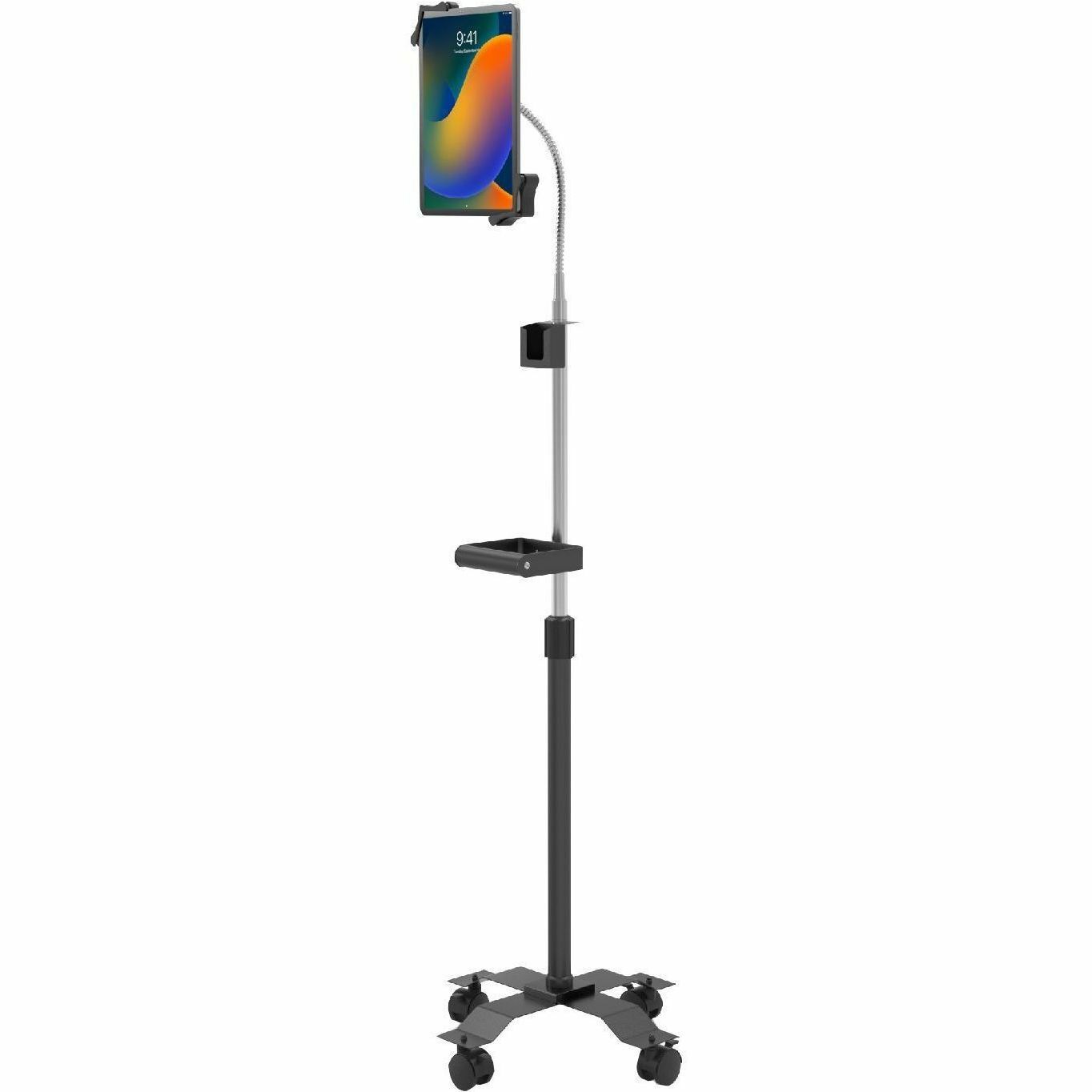 Create a mobile, adjustable tablet workstation that moves along with you - with CTA Digital's Compact Gooseneck Floor Stand with Handle. This stand is without equal in adjustability, featuring a powerful, flexible gooseneck and a tilting headpiece with easy 360-degree rotation. Steering your workstation is a breeze with the included handle. Simply choose your desired height, and attach handle with a simple loop clamp. Smooth-rolling swivel casters attach effortlessly to the stand base, giving your stand easy mobility in your office, home, classroom, retail space, or even at the gym. Customize the height-adjusting, telescoping pole. Attach the included storage cradle, which is perfect for an external battery pack or a stack of business cards. The quick-adjusting tablet holder slides open and secures your 7-13-inch tablet by the corners, leaving ports and buttons fully accessible.