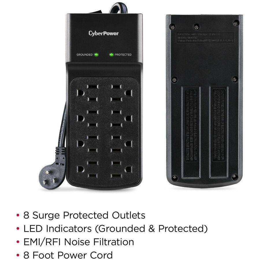 The CyberPower B808 8 outlet surge protector offers a high level of surge protection for common home and office electronics such as computers and peripherals, home theater equipment, and appliances. With 2180 joules of surge protection, the B808 prevents power surges and power spikes caused by storms and electrical grid fluctuations from reaching and potentially harming your valuable electronic equipment. The B808 comes with 8 standard, grounded power outlets and an extra long 8 foot power cord with a low profile grounded plug which fits tightly against walls for unimpeded placement behind furniture.