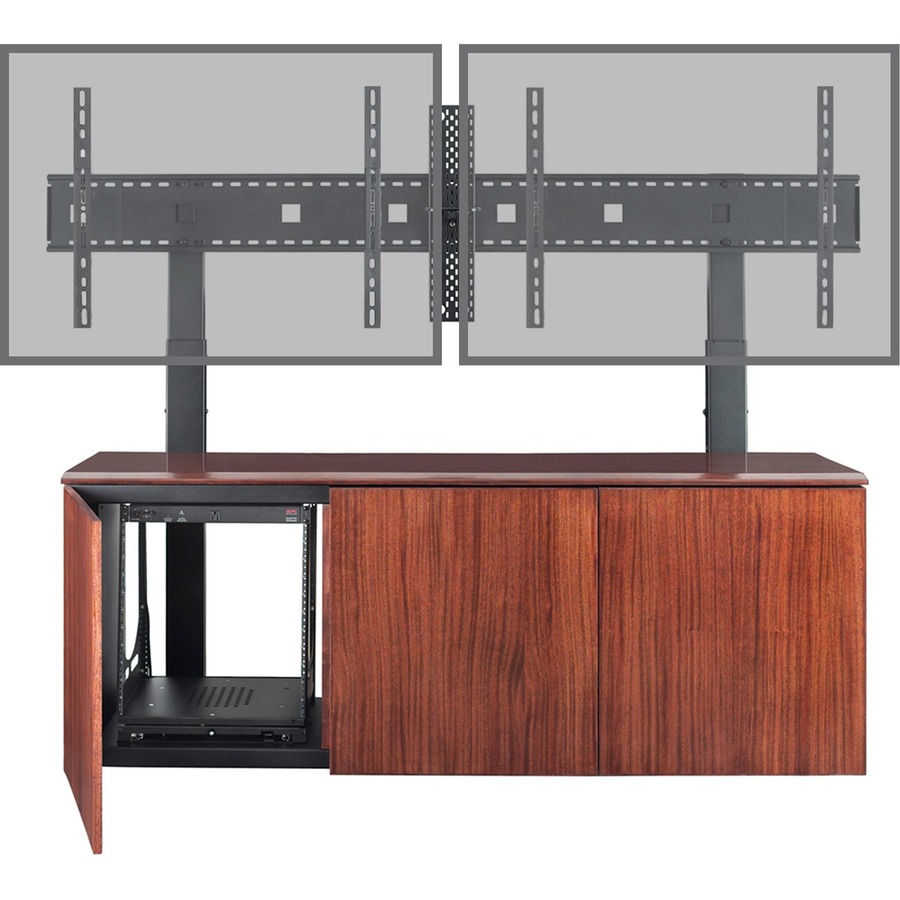 Our fully customizable 3-Bay Credenza can house all your audiovisual equipment and offers a unique integrated screen mounting system that eliminates wall-mounted displays. Our credenza comes with a sliding/rotating equipment rack on one end and two bays with removable/adjustable shelves, or enough room for a mini-fridge.