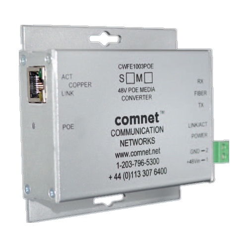 The ComNet CWFE1003POEM and CWFE1005POEM 2-port media converters provide full-duplex fiber optic transmission of a single channel of 10/100 Mbps Ethernet data (10/100 bASE-tX) through multimode or single mode optical fiber. type SC or type St optical connectors are available, providing the user with the flexibility to use these devices with virtually any multimode or single mode cable plant.