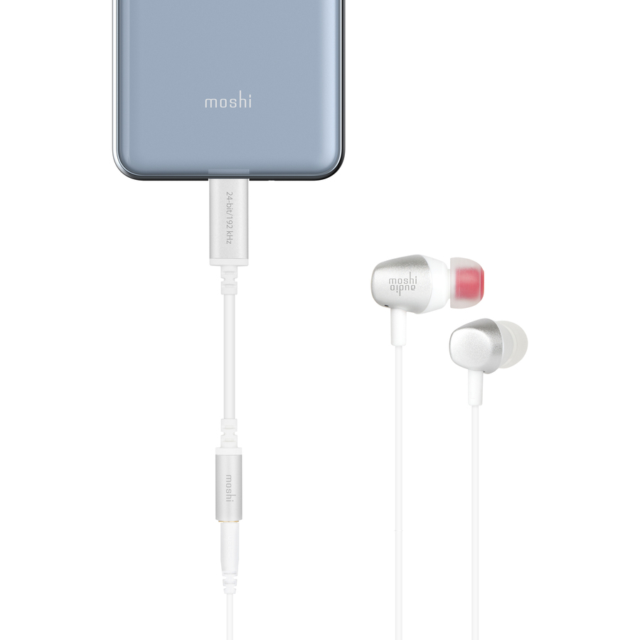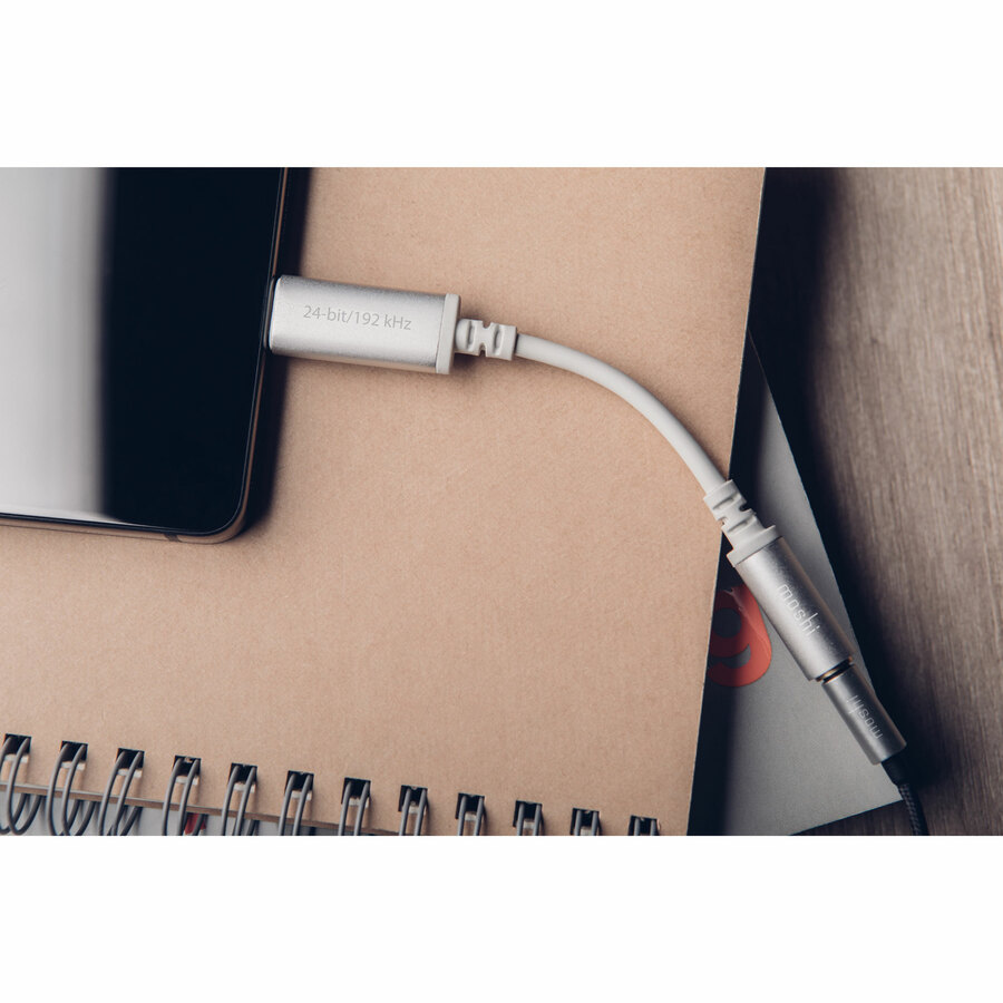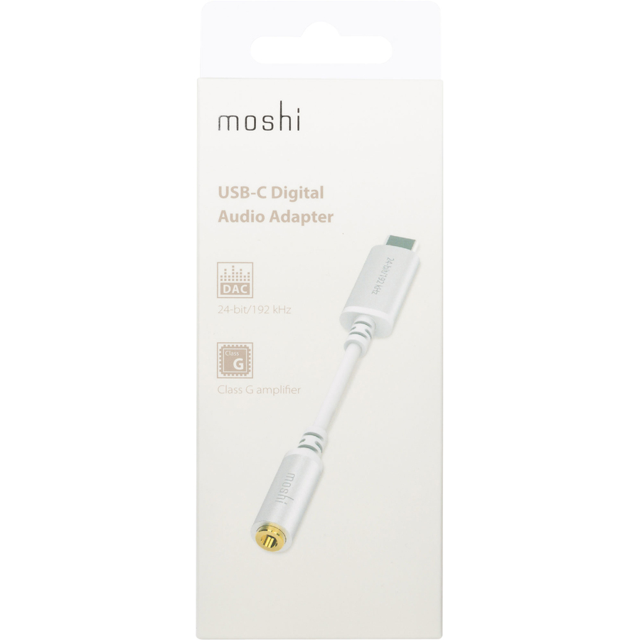 Moshi's USB-C Digital Audio Adapter lets you listen to music from your device's USB-C port using regular headphones. The built-in digital-to-analog converter (DAC) outputs high-resolution 24-bit/192 kHz audio signals, ideal for audiophile libraries or premium streaming services like Spotify, Tidal, Deezer, and more. A Class G amplifier enhances the quality of your headphones for a more robust and immersive sound experience. Anodized aluminum housings and reinforced stress relief points add durability, while protocol pass-through lets you control your music on the go. Pair this USB-C Digital Audio Adapter with Moshi's Avanti on-ear headphones so you can listen to music the way it was meant to be heard.