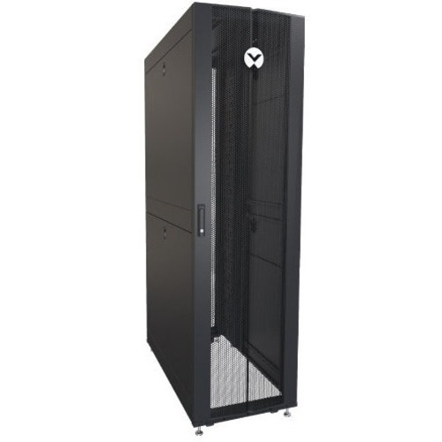 The Vertiv VR Rack VR3305 is a 45U server rack built with reliable engineering and is designed for simple and easy configuration. This server rack has dimensions of 2132mm x 600 mm 1200mm (height, width, depth), and has a deep frame that provides users around 2.5 inches more usable depth than similar sized racks. It has load capacities of 3,000 pounds static and 2,500 pounds dynamic. It is delivered ready for high density environments and supports a wide variety of equipment, including: servers, storage, PDUs, UPSs, console servers, and KVM switches. The zero U spaces in the Vertiv VR Rack have brackets and mounting holes for tool-less installation and removal of rack PDUs and cable management accessories. Each rack also comes with two sets of 19-inch EIA rails for sliding shelves, and the rack has split side panels with single locking slam latch that allows for easy single person installation and removal.
