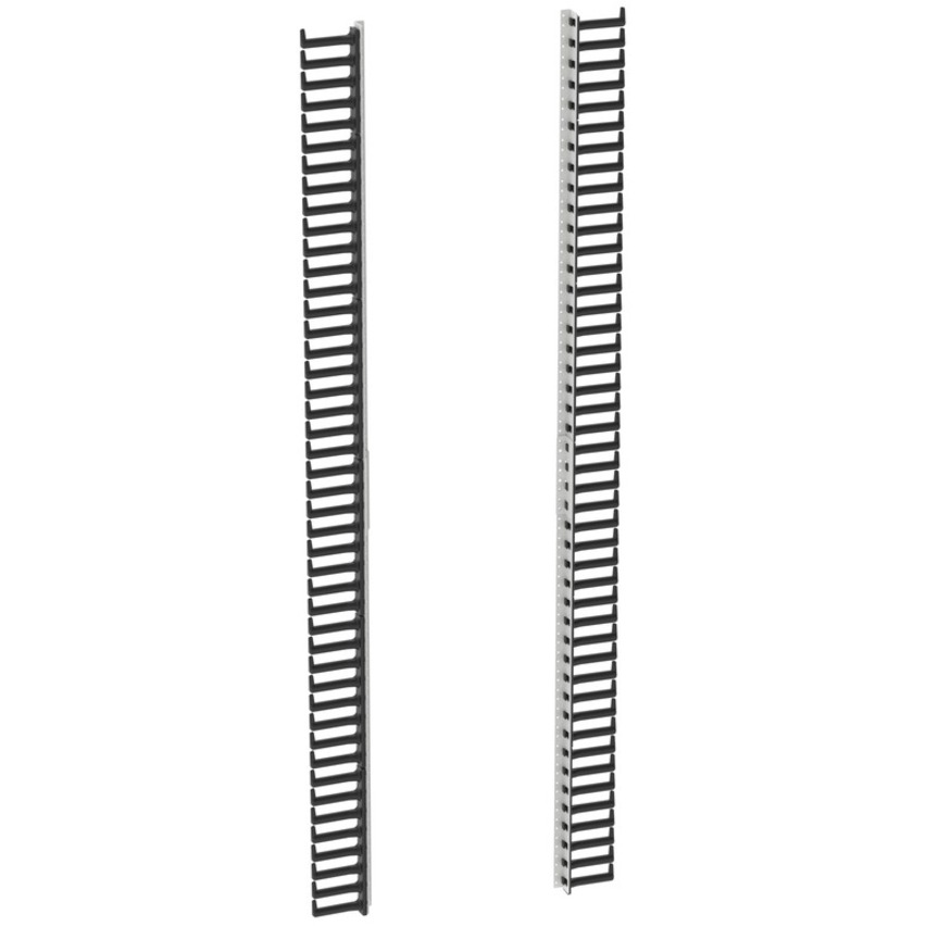 The cable management fingers include mounting brackets to be used with a 800mm wide cabinet. It attaches to the rails on a 48 RU Net-Verse™ Cabinet. It is white.