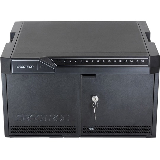 Fully assembled with Lightning cables installed, this compact cabinet enclosure features full 2.4A charging current per device, accommodating iPad Air, iPad (4th generation), iPad mini with Retina Display, and iPad mini tablets. Sync, charge, secure and manage up to 16 devices. Durable steel doors with robust three-point lock and key assembly provide strong theft deterrence.