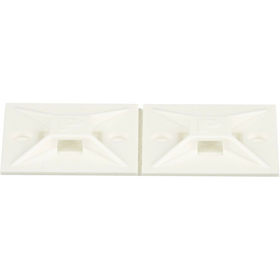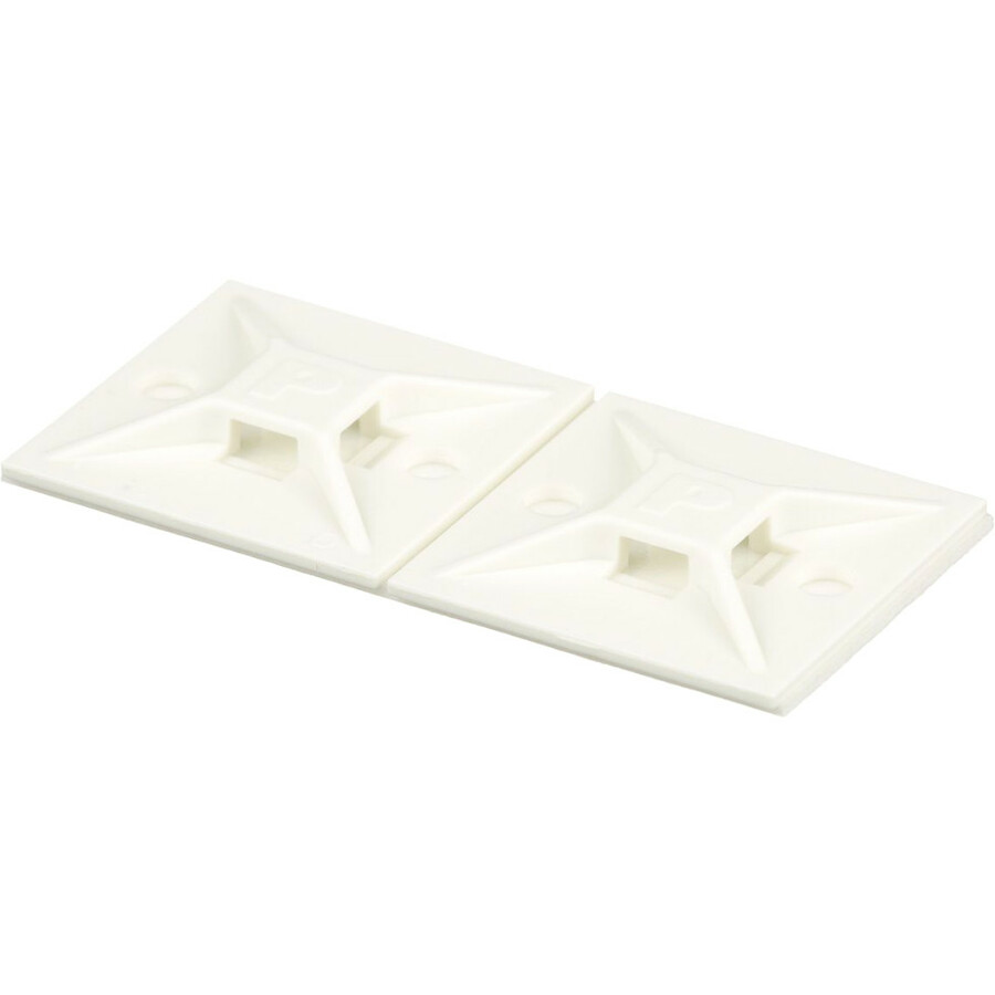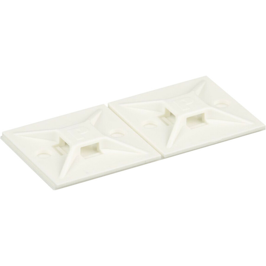 The 4-way adhesive backed cable tie mount in white is mounted with rubber adhesive tape. It is 1.12" long x 1.12" wide (28.5 x 28.5 mm) and made of nylon 6.6, which increases mechanical strength, heat and wear resistance, and stiffness. It is used with miniature, intermediate, and standard cable ties. It is designed for indoor environments and comes in packages of 500.