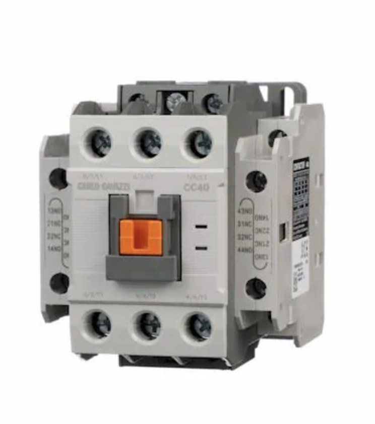 CARLO GAVAZZI CC40SD24 Contactors - Electromechanical Three-pole IEC style 40Amps rated (AC3 at 440VAC) contactor with screw terminals, 24 VDC coil and two normally open / normally closed auxiliary contacts.
