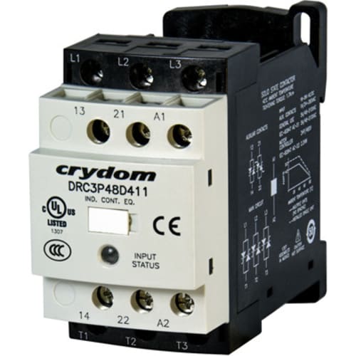 DRC3P60B411R Solid State Contactor, 3-Phase, DIN Rail Mt, 600VAC 4.8A, Control: 90-140VAC, Aux: 1NO+1NC, RN, 3Legs, 3PST-NO (3 Form A), Screw Terminal, -30°C ~ 80°C