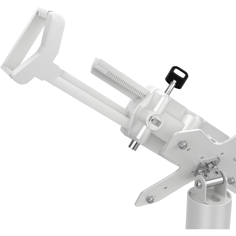 When you need a desk mount and universal tablet enclosure that helps you work better, look no further than CTA Digital's Desk Mount with Integrated 2 Port USB Hub w/ Universal Holder. This sturdy white metal stand features two standard USB ports for speakers, phone charging, and whatever tech gadgets make your workspace more useful. The mount securely holds virtually any 7-14-inch tablet with an adjustable frame that cradles the corners then locks in place with the turn of the included key. Handy foam adapters provide the padding necessary for a tight fit within the corner brackets. Route cables neatly out of sight within the body of the stand. This versatile unit rotates for use in both portrait and landscape modes and is perfect for waiting rooms, lobbies, gyms, conference rooms, or any place you need a secure stand with locking mount.