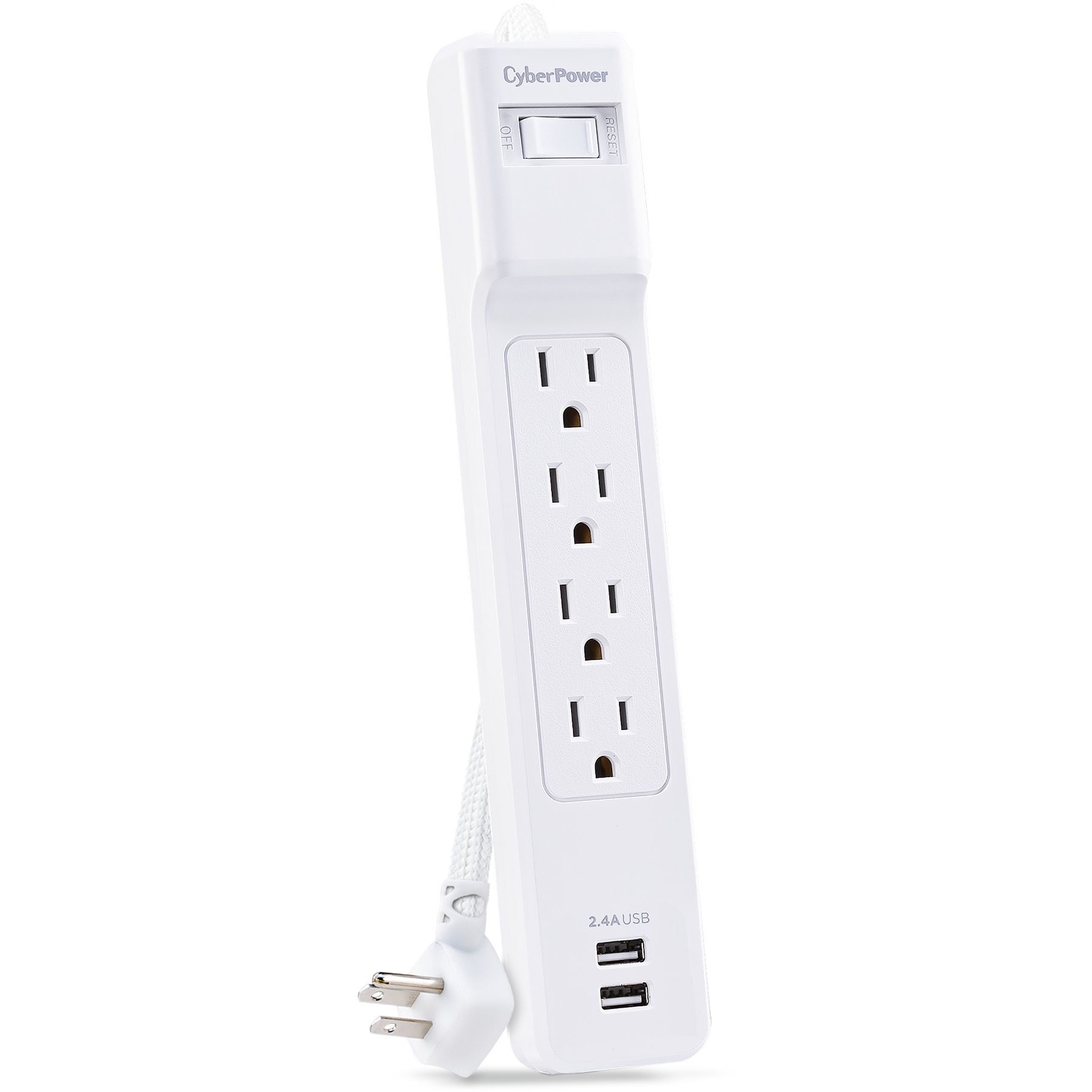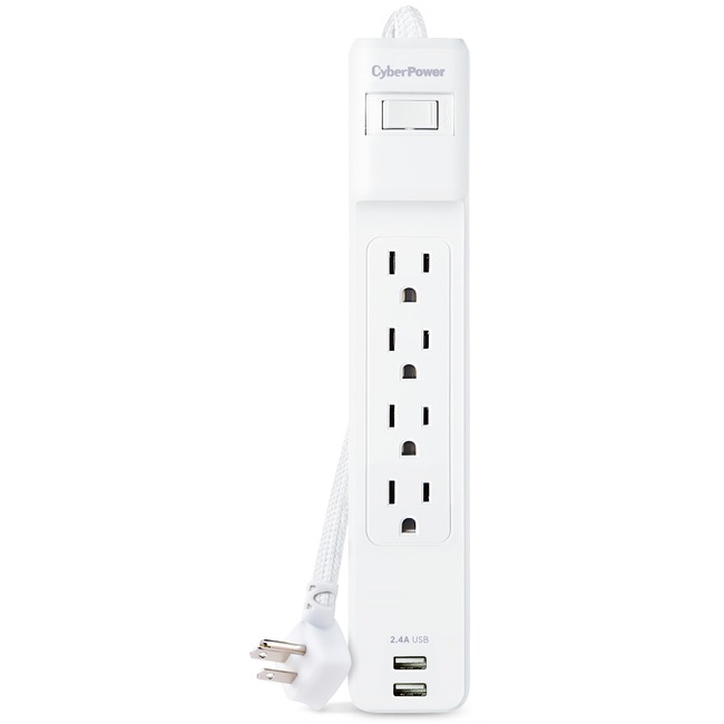The CyberPower Surge Protector P406U prevents spikes in energy caused by storms and electrical power surges from reaching your home electronics such as audio/video equipment, laptops and desk top computers, household appliances and small electronics. The P406U provides 500 joules of surge protection, 4 AC outlets, two USB-A charging ports, and a braided 6 foot power cord with a right-angle plug.
