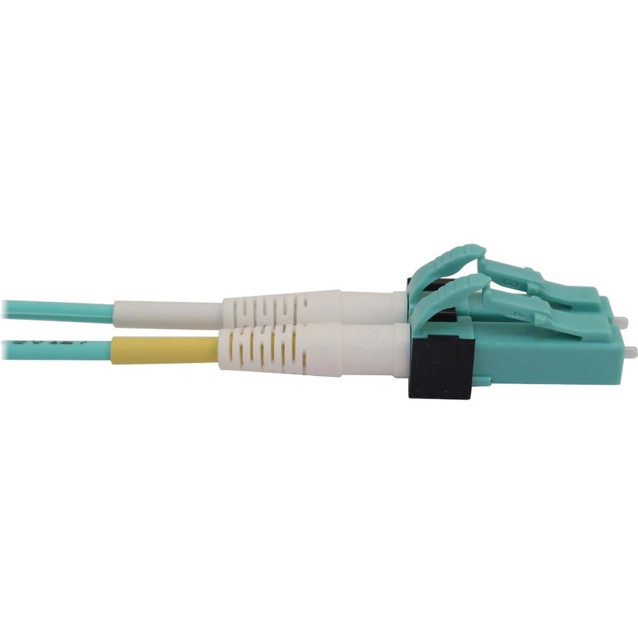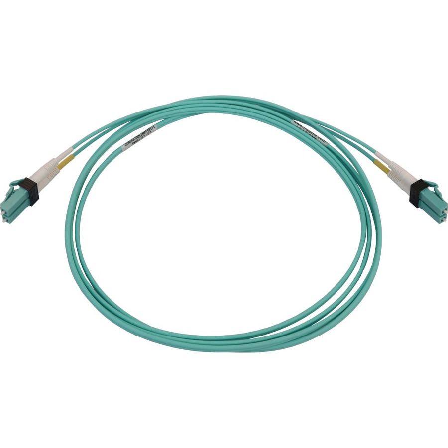 The OM4-rated cable has an aqua jacket to identify it as multimode in a crowded patch panel or switch and prevent it from becoming accidentally disconnected. The round low-smoke zero-halogen (LSZH) jacket limits the amount of toxic smoke emitted in case of combustion, making it suitable for poorly ventilated areas.