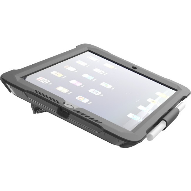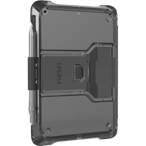 The clear shell allows for easy viewing of school logos or asset tags placed beneath the surface. An adjustable stand on the back provides viewing and typing angles while sound channels carry audio to the front, where it belongs. A protective screen cover prevents accidental scratches while also locking in and securing your iPad within the case. A removal tool is included.