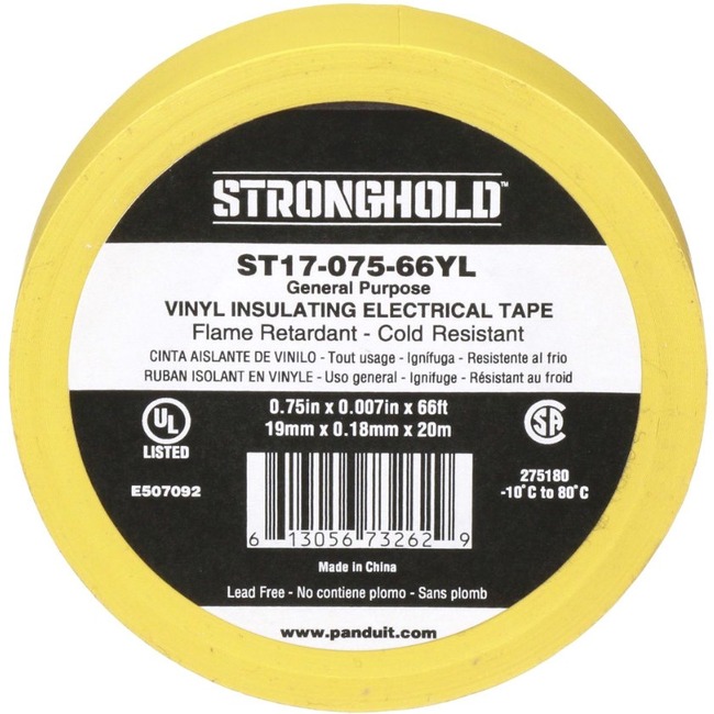 Product Name | StrongHold ST17-075-66YL Electrical Tape, Yellow, PVC, Gen Purpose, .75" , .007" |
