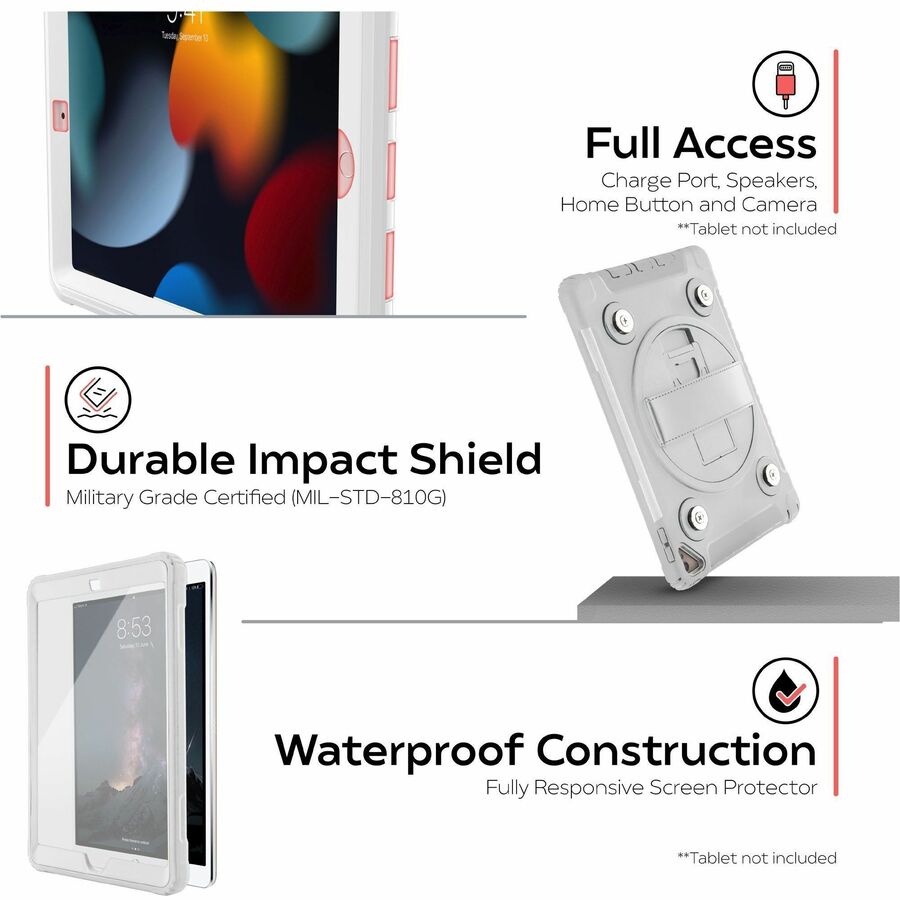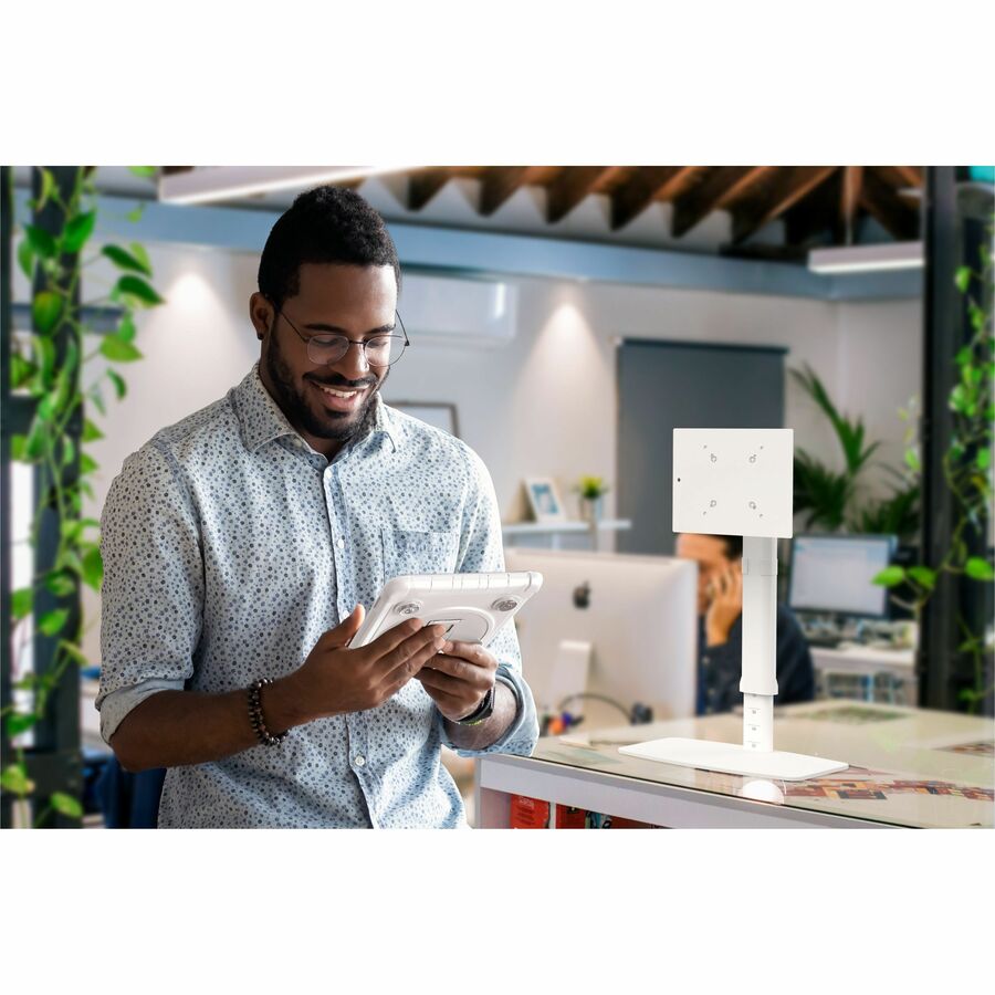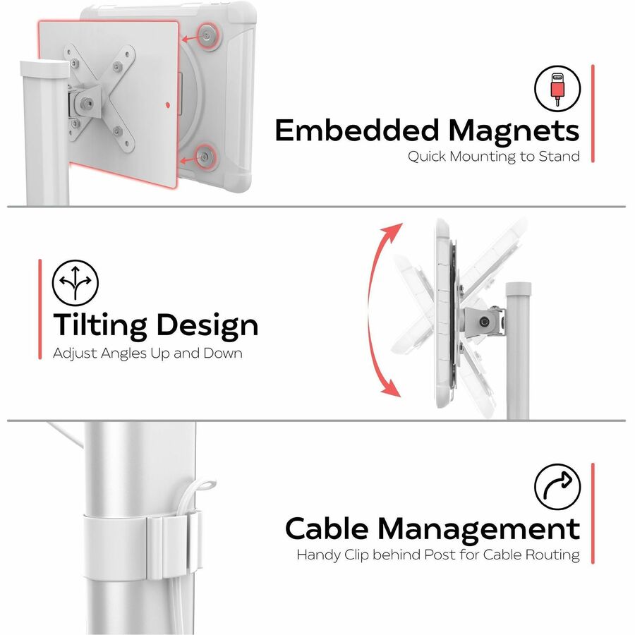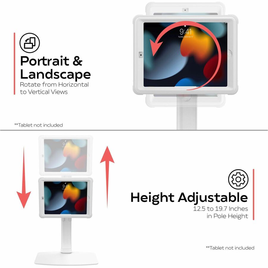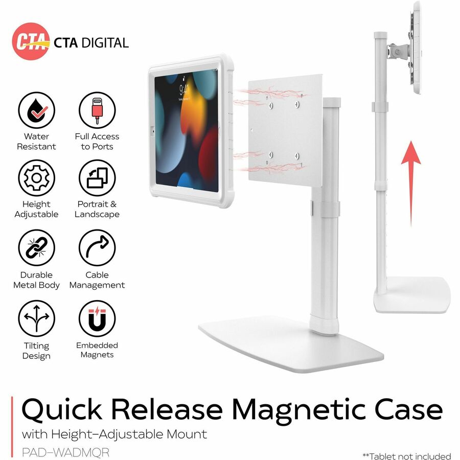 Enjoy fast, effortless handheld-to-wall setups with CTA Digital's Height-Adjustable Mount with Quick Release Magnetic Case. This intuitive case and stand create a sleek countertop solution for home office, kitchens, conference rooms, or any place that requires a tablet. The sturdy steel base provides a secure weighted and padded holder for CTA's popular magnetic, splash-proof case. Adjust height from 12.5 - 19.7 inches. The VESA plate attachment rotates 360-degrees and tilts up and down for viewing at multiple angles. The case is made from durable military-grade silicone, and provides splash-proof and impact-resistant protection. Handy magnets allow fast transitions between stand and handheld use. Its design allows full access to all ports and speakers of iPad 7th-9th Gen 10.2-inch, iPad Air 3, and iPad Pro 10.5-inch tablets. A handy clip behind the center post neatly routes cables out of the way.