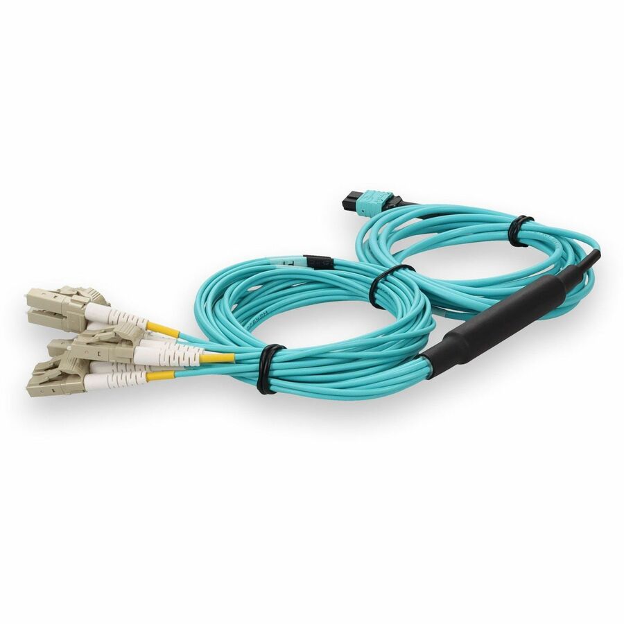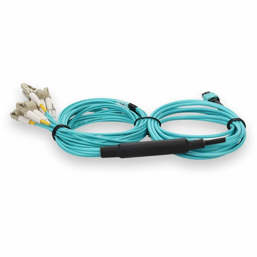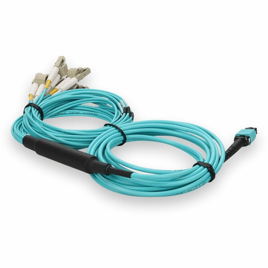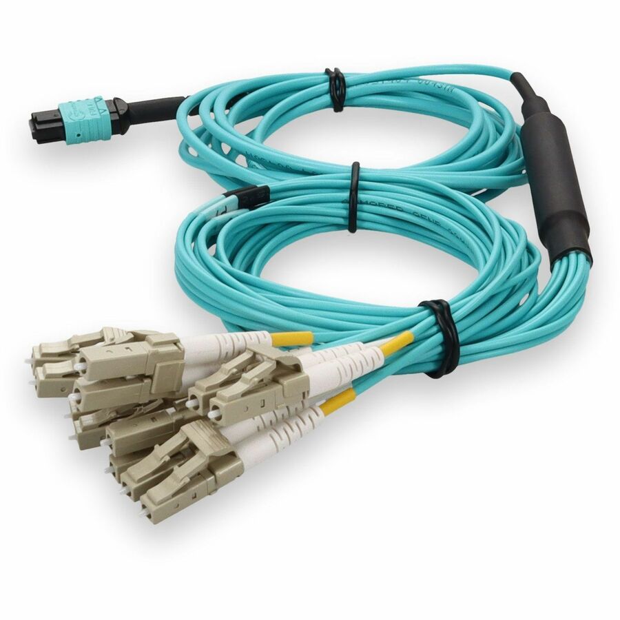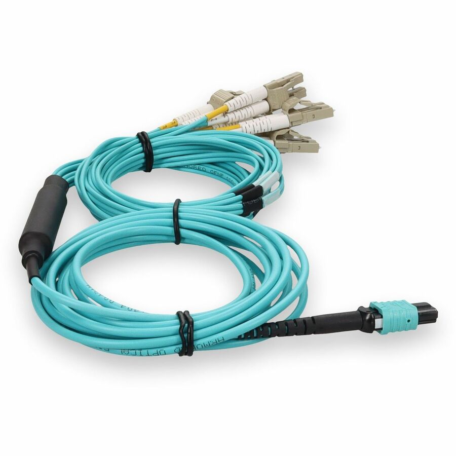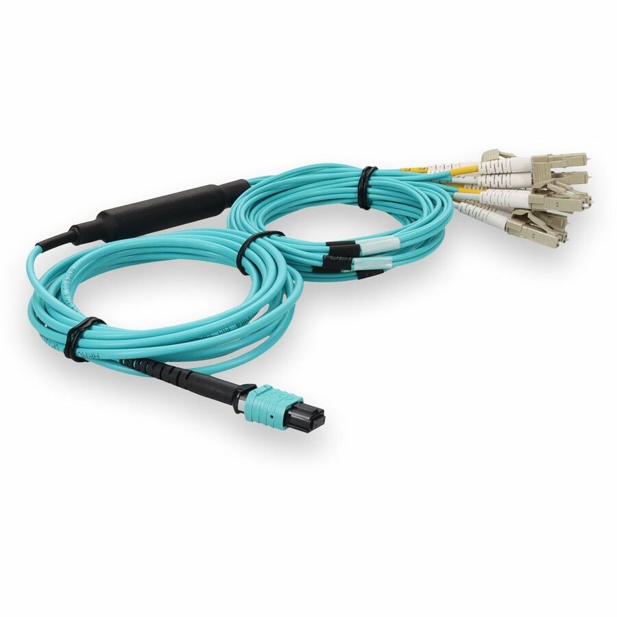 This is a 3m MPO (female) to 12xLC (male) 12-strand aqua riser-rated fiber fanout cable. An OM4 cable has a core size of 50m microns that supports 10 Gigabit Ethernet at lengths measuring up to 550 meters, and 100 Gigabit Ethernet measuring up to 150 meters and is reverse compatible with OM3. This optical fiber, nonconductive, riser (OFNR) cable is best suited for use in interior fiber-optic applications. Our patch cables are 100% compliant for all of your networking needs. Our products are guaranteed by federal law to not affect or void OEM warranties.