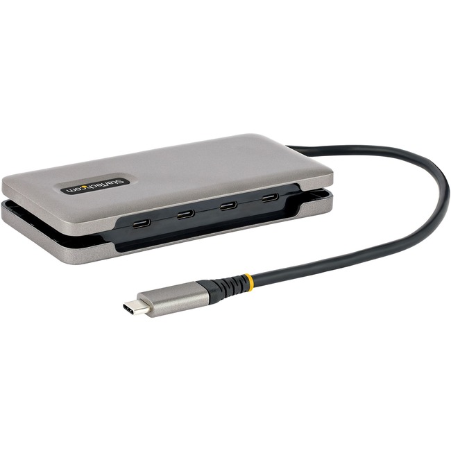 This 4-Port USB-C Hub with optional USB Power Delivery (PD) pass-through, expands the connectivity of a USB-C laptop. This hub features four USB 3.2 Gen 2 (10Gbps) Type-C ports, that support high-bandwidth USB peripherals. Connect the attached USB-C cable to a USB Type-C or Thunderbolt™ 3/4 port, located on the host computer, to enable the quick connection of up to 4 peripherals. This lightweight USB-C Hub can operate with bus-power. Alternatively, connect a USB-C power adapter (not included) to the designated USB-C PD port for laptop charging.