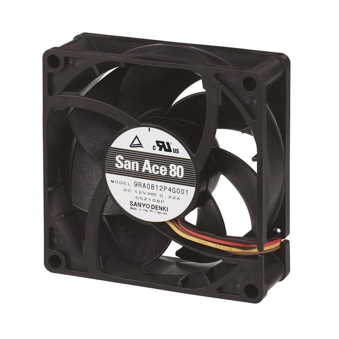 SANYO DENKI 9RA0812P4G0011 DC Fan, Sq80x25mm, 12VDC 0.22A, 49.4CFM, 37dBA, Ribless, Tach PWM, 4wire