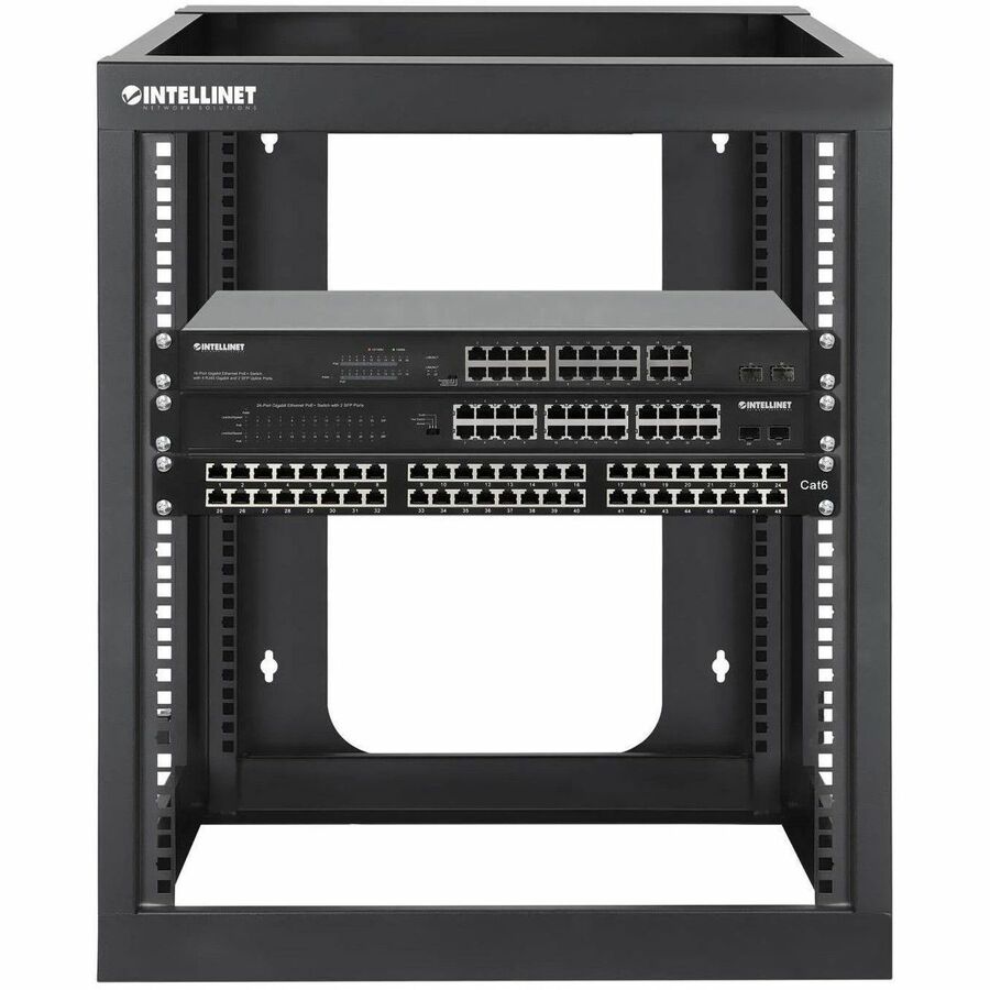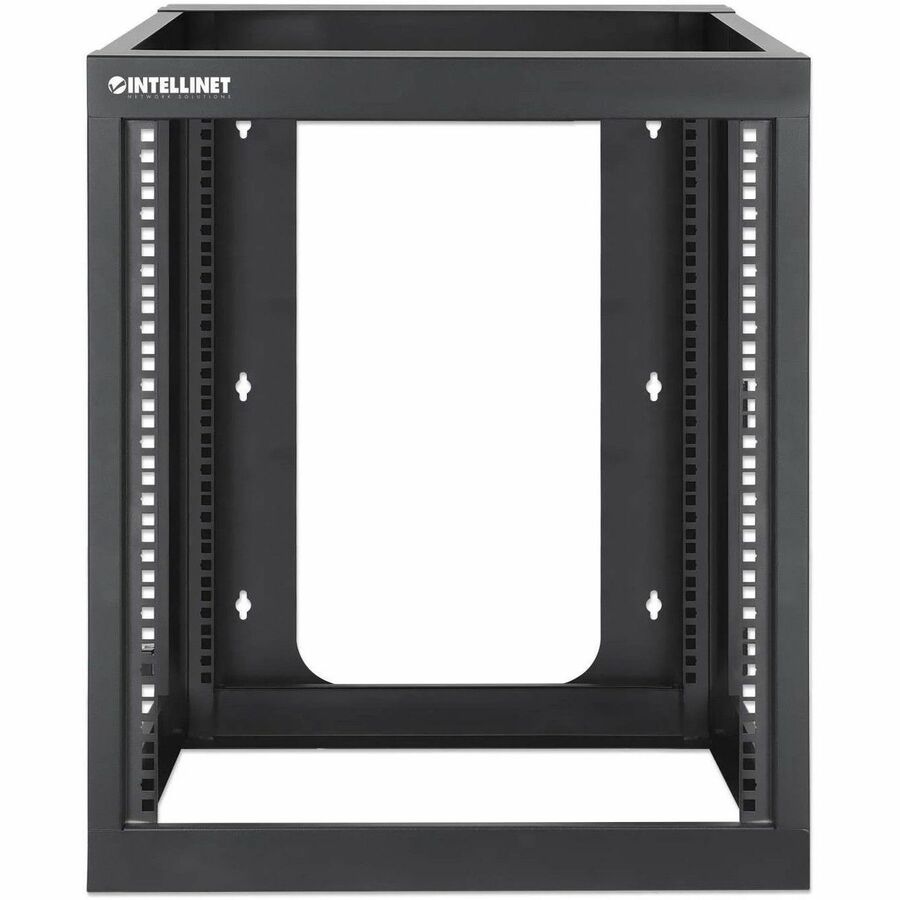 The 12U 19" Wall Mount 4-Post Open Frame Network Rack from Intellinet Network Solutions is a simple, cost-effective way for housing IT equipment in secure environments that don't require a lockable rack solution. It's a great fit in places where small rack solutions are often dispersed throughout an organization, like at a remote location or branch office. Its relatively compact design lets you place it out of the way on a desk or mount it on a wall instead of taking up floor space.