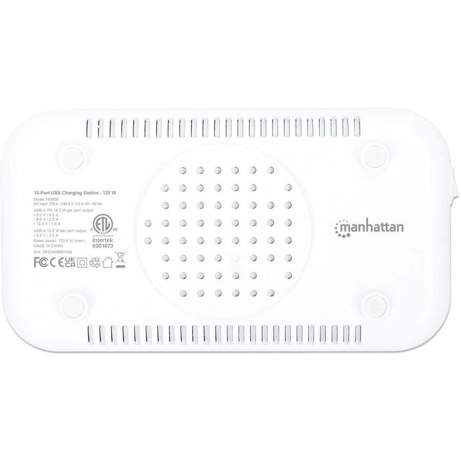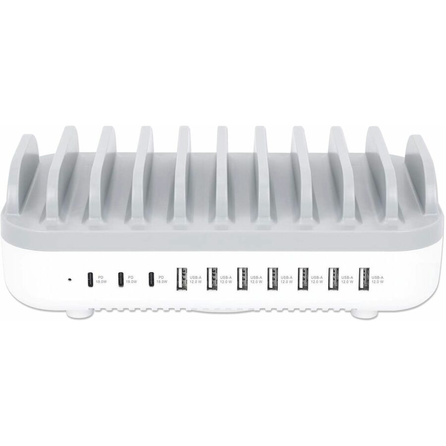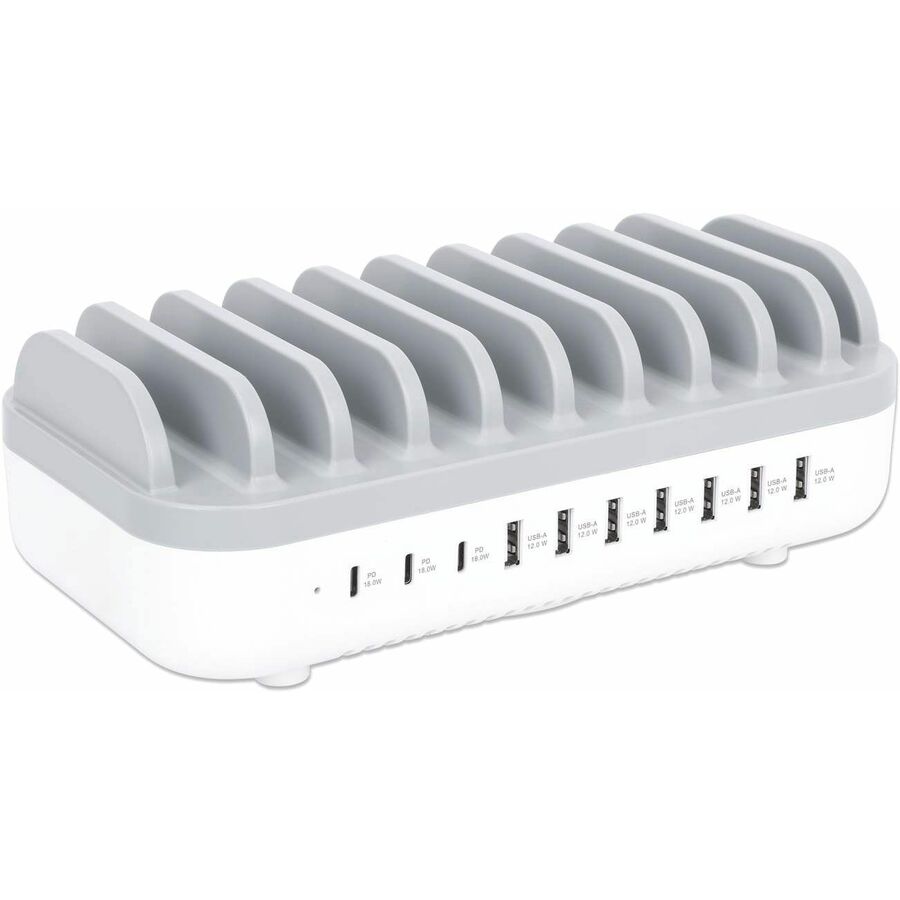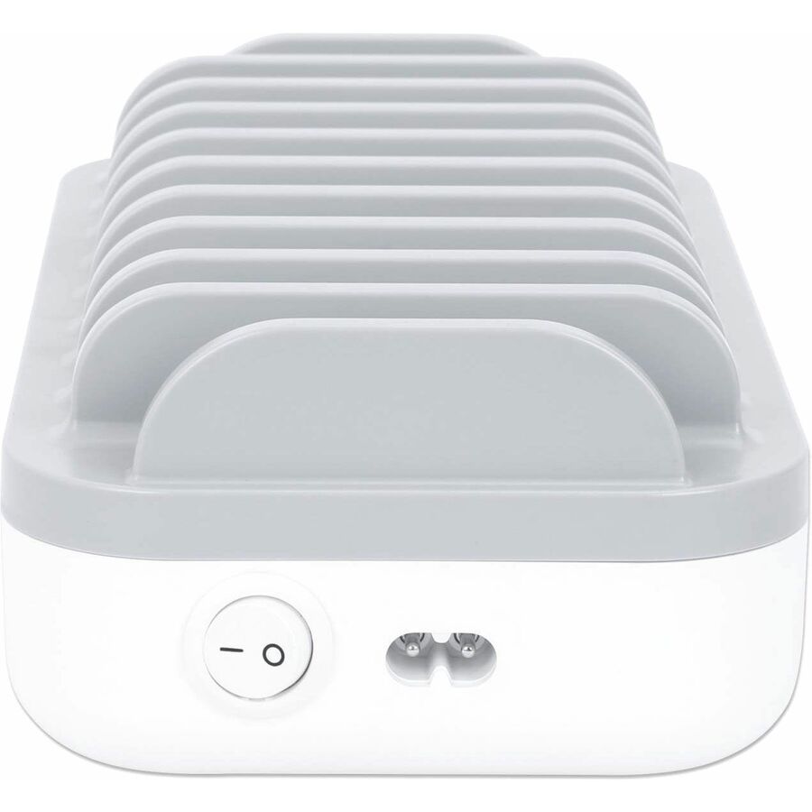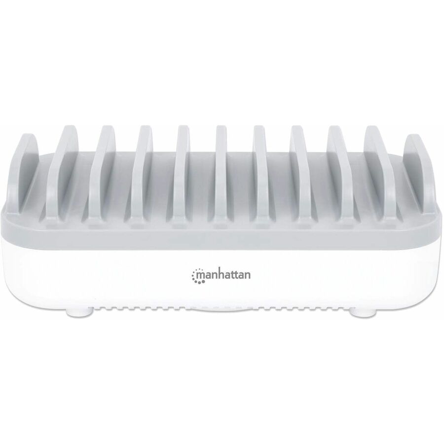 The Manhattan 10-Port USB Charging Station keeps USB-powered devices - tablets, phones, cameras, Bluetooth headphones and portable game consoles - charged and ready to go. It plugs into any standard wall outlet and offers rapid charging, so it's perfect for home, school and office use. To help with organization, ten wide bays fit most devices in their cases, keeping the countertop clean and clutter-free. That means everything can charge in one place, without having lots of chargers plugged into a power strip or devices spread all over your desk. It also means you'll have some freed-up USB chargers to stow in a laptop bag, purse, luggage bag or briefcase for when you need to charge devices away from home or the office.