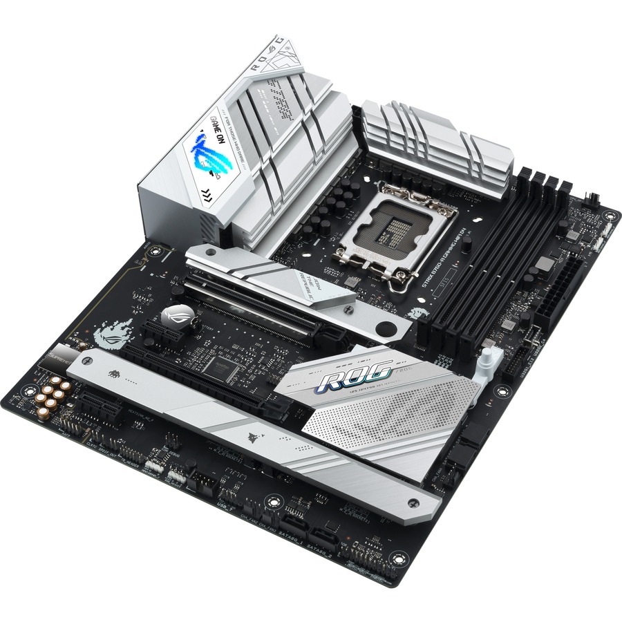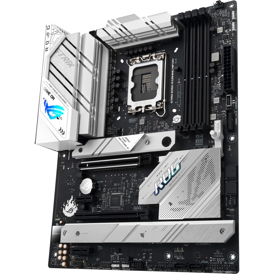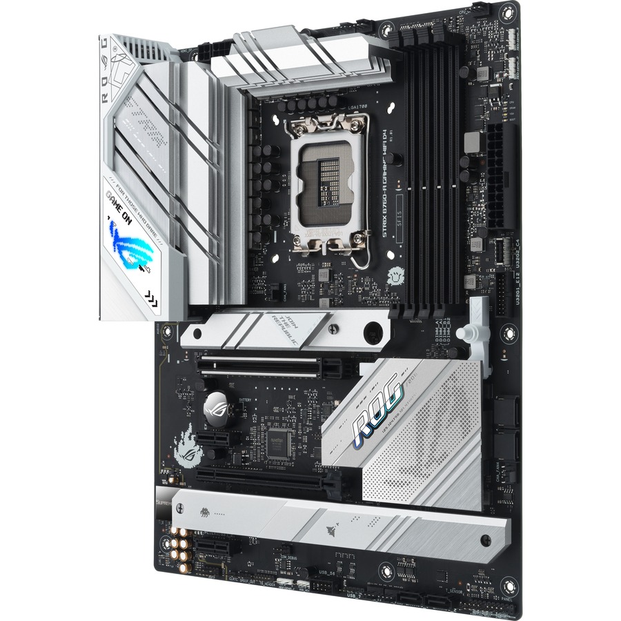 On its face, the Strix B760-A D4 wears a light aesthetic, but beneath its grey aluminum heatsinks lies a dark PCB flush with high-performance hardware. A VRM configuration equipped to handle high-core-count Intel® 13th Gen processors, PCIe 5.0 bandwidth for graphics cards, and next-gen WiFi 6E team up to bring devilishly good gaming to this heavenly board.