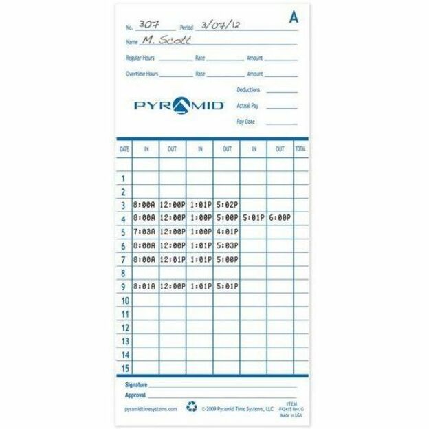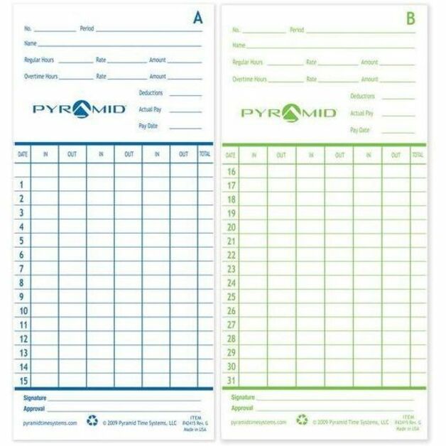 Two-sided time cards for Pyramid 2600, 2650, 2650Pro, 6200 and ,6400 Time Clocks. Side A includes days 1-15; Side B includes days 16-31. Data fields include Number, Period, Name, Regular Hours, Rate, Amount, Overtime Hours, Rate, Amount, Deductions, Actual Pay, Pay Date, Employee Signature, Supervisor Approval and six columns for three IN/OUT Punch cycles with Total Column. Notched bottom design enables time clock to detect correct side of time card.Heavy duty card stock.100/pk. Printed in USA.