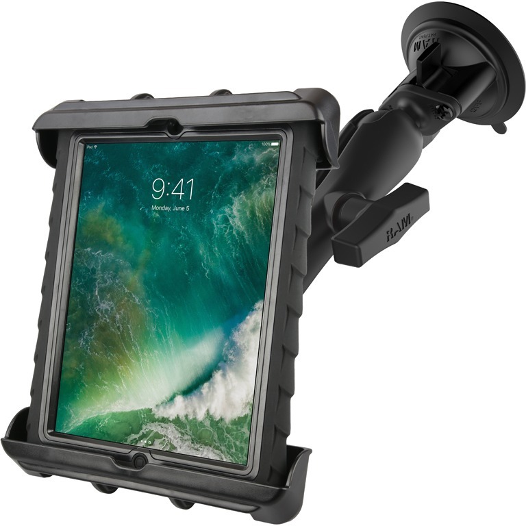The RAM-B-166-TAB17U consists of a 3.3" diameter suction cup twist lock base with 1.5" dia. ball, double socket arm, round base adapter and Tab-Tite™ universal clamping cradle. The suction cup base is designed to have a strong hold on glass and non-porous plastic surfaces. The spring loaded Tab-Tite™ cradle makes it easy to load and unload your tablet, along with keeping it secure while on the go. Interchangeable cup ends are designed to optimize the functionality of your tablet, allowing access to audio jacks, usb, power, and other ports, your tablet can be used just as it was intended. The Tab-Tite™ cradle is compatible with any tablet that will fit the dimensions listed below. It is important to verify the dimensions of your tablet when determining the overall size.