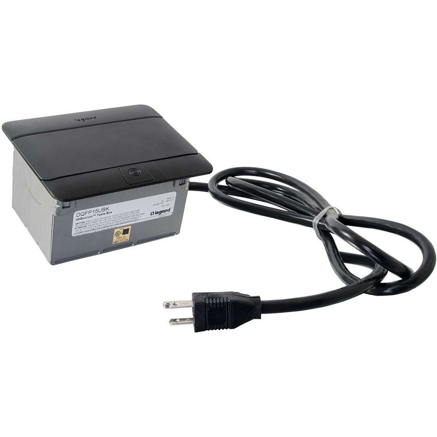 deQuorum™ Flip-Up Table Boxes offer sleek, attractive designs and are the perfect solution for adding power to table tops, counter tops or other surfaces in conference rooms, meeting rooms, hotel rooms, kitchens, and class rooms. For enhanced safety, the receptacles feature our patented shutter system that prevents the insertion of foreign objects. UL spill water protection exceeds UL1363 standard for relocatable power taps, eliminating the risk of shock or short circuiting due to moisture entering the device. The table box also offers duplex USB ports for charging cell phones, tablets, and other mobile devices.