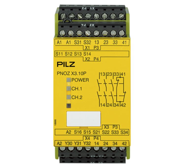 Safety relay (standalone), inputs: 1/2-channel wiring with/without detection of shorts across contacts, outputs: 3 N/O, 1 N/C,1 SC, automatic/monitored start, UB 24 V AC/DC, width: 45 mm, plug-in screw terminals, monitoring of E-STOP, safety gates, sidewardscompatibility with PNOZ X3.