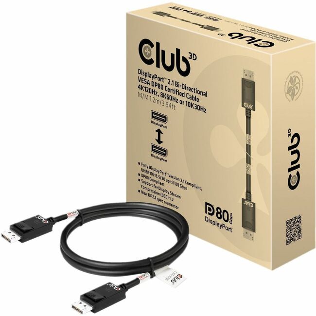 The Club 3D CAC-1091 DisplayPort 2.1 Cable enables the connection of your DisplayPort supported (Gaming) PC or Laptop to an (Ultra) High Resolution Monitor or other DisplayPort supported device. DisplayPort 2.1 UHBR10/13.5/20 up till 80 Gbps, also has support for Display Stream Compression 1.2 (DSC), Forward Error Correction, and extends the maximum number of inline audio channels to 32. It features locking DisplayPort connectors providing a secure, dependable connection, with NEW contact fingers special designed for these high speeds. Simply press the built-in one-touch latch button to unlock the connector. The soft UltraFlex jacket protects the cable from bends and deformation damage.