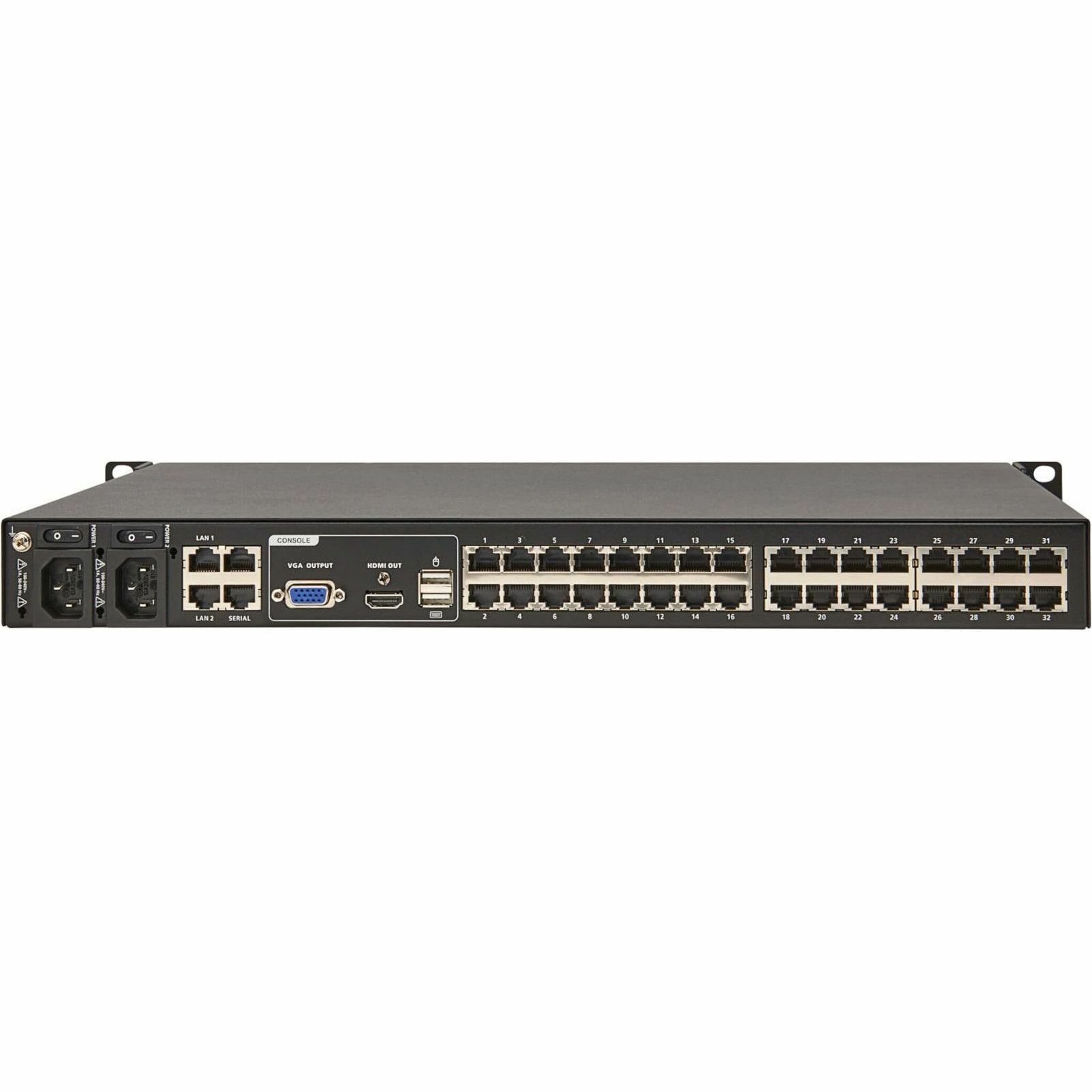 HDMI and VGA ports with high-resolution video up to 1920 x 1200 (at 60 Hz) with 24-bit color depth provide a GUI with management tools, including an event log, auto-scanning and panel array mode. Both ports may be in use at the same time. The OSD may be set to display in English, German, Russian, Japanese, traditional Chinese or simplified Chinese.