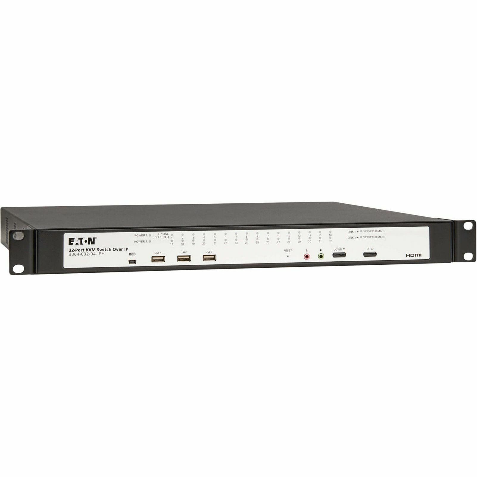 The B064-032-04-IPH eases multi-server management in small to large enterprise data centers, as well as applications with multiple or remote users accessing equipment. Built-in IP capability allows up to four users, either one local and three remote or all four fully remote, to access the network independently and simultaneously. An optional dial-in connection (modem port) is provided to ensure access in situations when the KVM switch is not available over the primary network. You may also select a connected computer using on-console pushbuttons, GUI (graphical user interface), OSD (on-screen display) or keyboard hotkey commands. An LED per KVM port indicates when a computer is connected to the port, when it is powered on and when it is selected.
