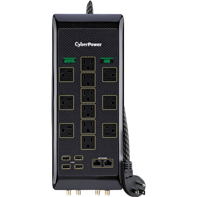The CyberPower Premium Surge Protector PBJ5UC is ideal for the home, office, or home theater because it is designed to provide maximum protection and convenience to a number of devices where wall receptacles are out of reach. The Premium Surge Protector prevents damaging spikes in energy caused by storms and electrical power from reaching your electronic equipment. The PBJ5UC provides 3480 joules of protection, 12 outlets (6 widely spaced for transformer plugs), 4 USB charging ports, and a right-angle, 5-foot braided power cord.