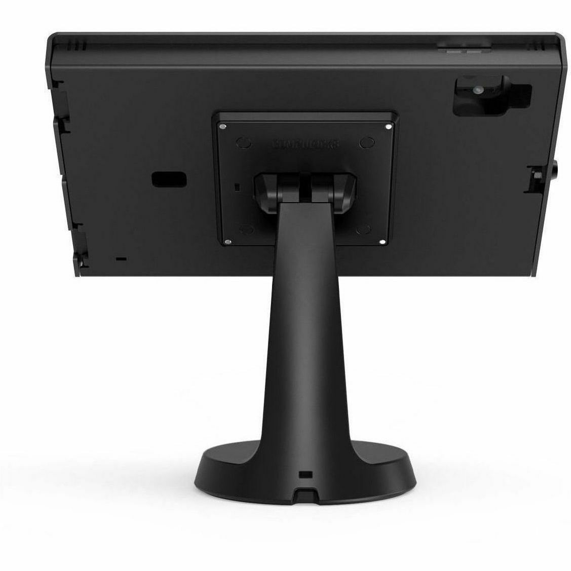 It offers full reverse screen tilt, integrated cable management, a charging cable trap, and optional add-ons like a VESA rotating plate, an adhesive swivel base, and a stability base for larger tablets.