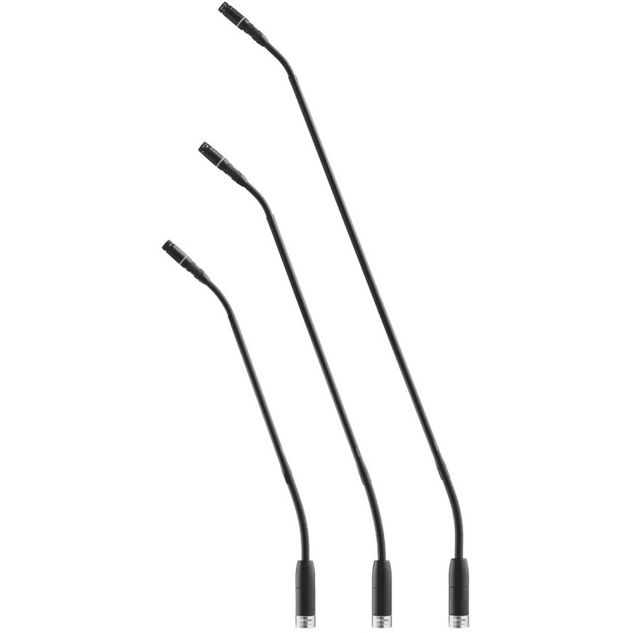 The MXC416, MXC420 and MXC425 are gooseneck microphones for use with the Microflex® Complete (MXC) digital conference system and the Microflex® Complete Wireless (MXCW) conference system. The gooseneck design is highly flexible, allowing precise positioning by each speaker. The microphone is available with single or dual flexible sections and can be used with all MXC / MXCW conference and interpreter units. The microphone includes a cartridge with a cardioid polar pattern and the frequency response is tailored to improve speech intelligibility and reduce feedback. The microphone is also compatible with Microflex cartridges with other polar patterns. A snap-fit foam windscreen that reduces plosives or wind noise is included. The microphone features CommShield® Technology which provides improved immunity to RF noise caused by mobile phones, tablets, or similar devices nearby. A two-color LED ring illuminates when the conference unit is active or in request-to-speak mode. This clearly identifies the speaker to other members of the meeting, even under bright lighting. The microphone is detachable with a 10-pin modular connector. When used with compatible conference units, the microphone can be locked with a hex key to prevent unauthorized removal.