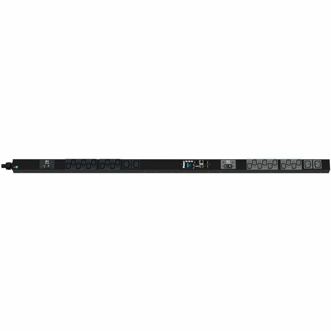 The Panduit™ G6 Monitored Input PDU features (20) C13 and (4) C19 outlets. It is a 30 amp, 208 V, single phase PDU with a NEMA L6-30P input plug and a 10 foot (3m) power cord. The PDU is black.