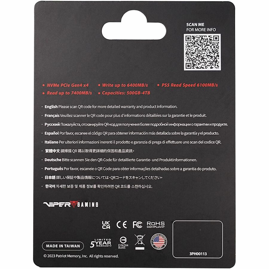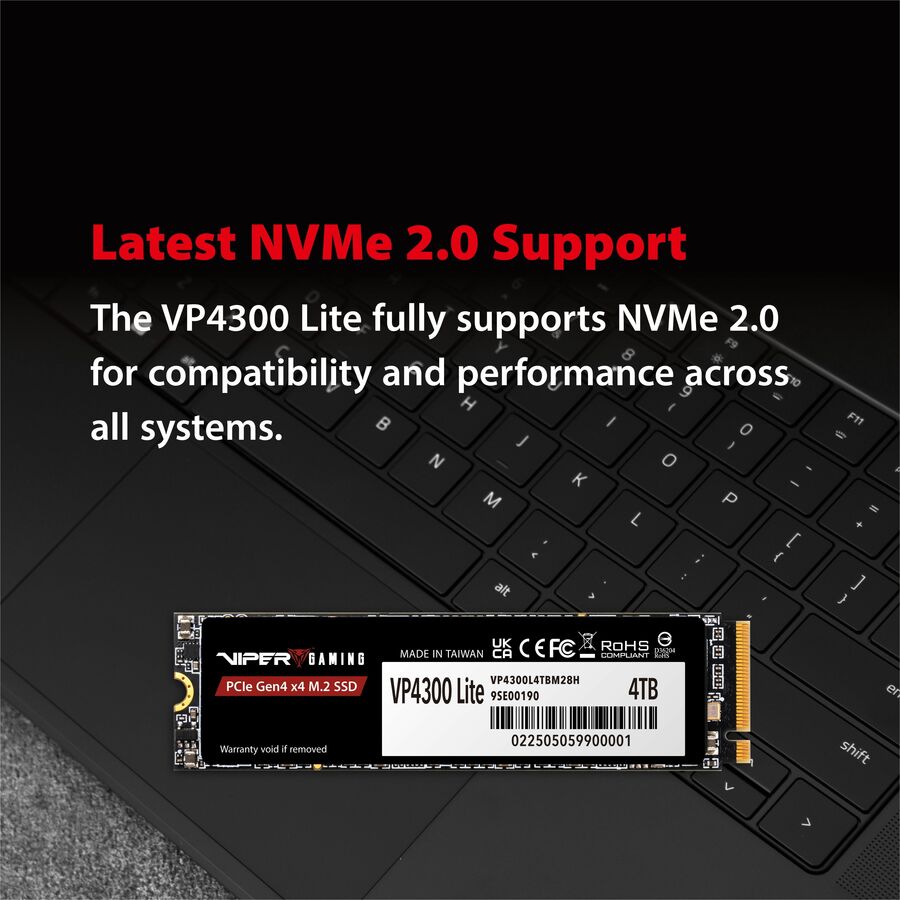 Built with the latest PCIe Gen4 x4 controller, fully compliant with NVMe 2.0 and fully compatible with both PCs and the Playstation 5, the VP4300 Lite is the latest in Viper Gaming's high-performance solid state drive line. Featuring Viper Gaming's newest DRAMLESS design, gamers can anticipate sharp performance with the VP4300 Lite's host memory buffer support and Toggle 5 and ONFi 5 mode Flash support for double data rates up to 2,400 MT/s. Alongside its Seq. Read speeds up to 7,400 MB/s, Seq. Write speeds up to 6,400 MB/s, PS5 sequential read speeds up to 6,100 MB/s and 2,000 TBW, the VP4300 Lite will blow away the competition every time.