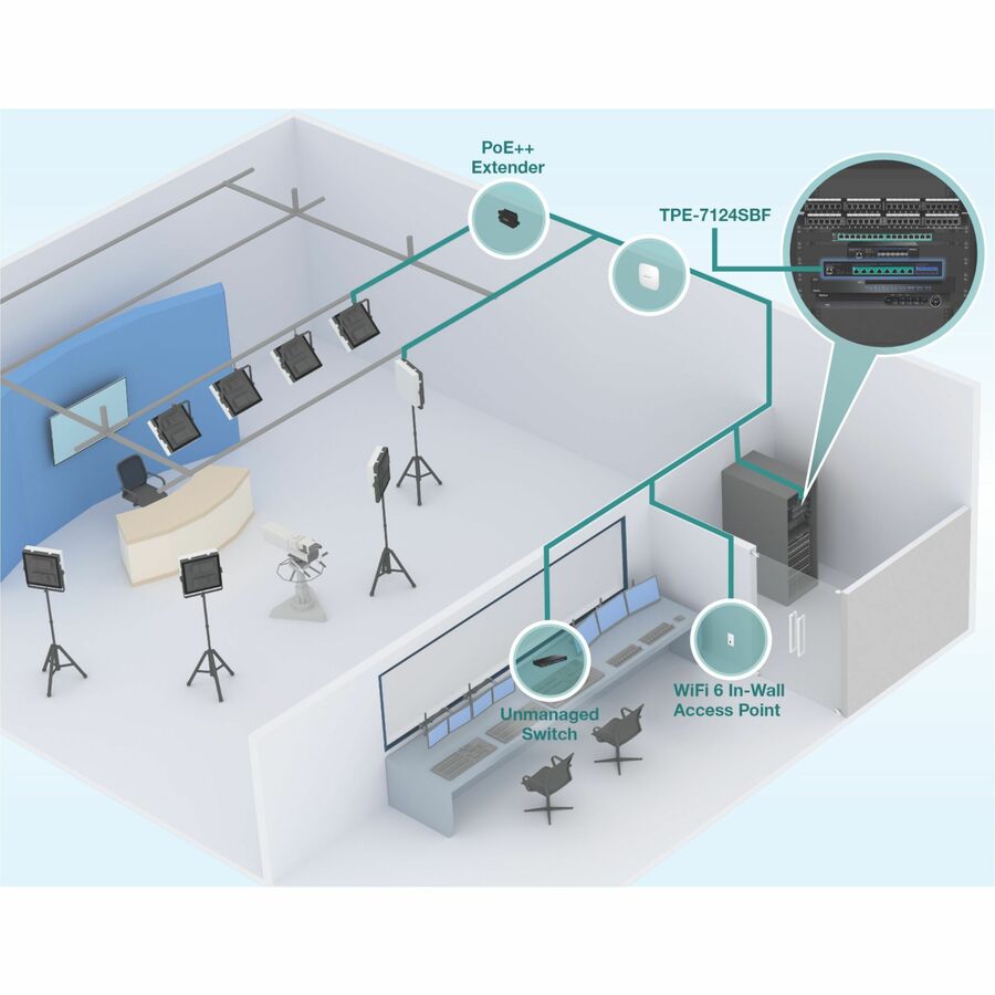 TRENDnet's 12-Port 10G PoE++ Web Smart Switch (720W), model TPE-7124SBF, offers advanced traffic management controls to meet the evolving demands of SMB networks. This 10G managed PoE++ switch comes with an intuitive web-based interface.Management features include LACP to increase bandwidth between switches, VLANs for segmenting and isolating virtual LAN groups, QoS for traffic prioritization, port bandwidth controls, and SNMP monitoring, making this a powerful solution for any SMB network. Improve voice performance by isolating and prioritizing VoIP traffic from normal data traffic with an easy-to-use voice VLAN feature.Free up router resources by offloading routing processes to this 10G managed PoE++ switch by using the L2+ IPv4/IPv6 static routing feature to efficiently route traffic at the switch level. The dynamic ARP inspection feature helps protect connected devices from man-in-the-middle attacks. Take advantage of the available multicast and IGMP/MLD snooping features to optimize IPsurveillance system performance, and minimize network traffic.This 12-Port 10G managed PoE++ switch also features eight 10GBASE-T PoE++ ports, and four 10G fiber SFP+ ports for longdistance, high-speed network connections, providing a cost-effective solution in adding 10G link capability to an SMB network.Installers and integrators can save on equipment costs and reduce installation time with TRENDnet's 10G PoE++ switch by delivering up to 90W per port of PoE power and data over existing Ethernet cables. Easily network PoE devices with a 720W PoE budget to devices, such as high-power wireless access points, LED lighting, digital signage, IPTV decoders, access controls, cameras, and more with this high-power 10G managed PoE++ switch.
