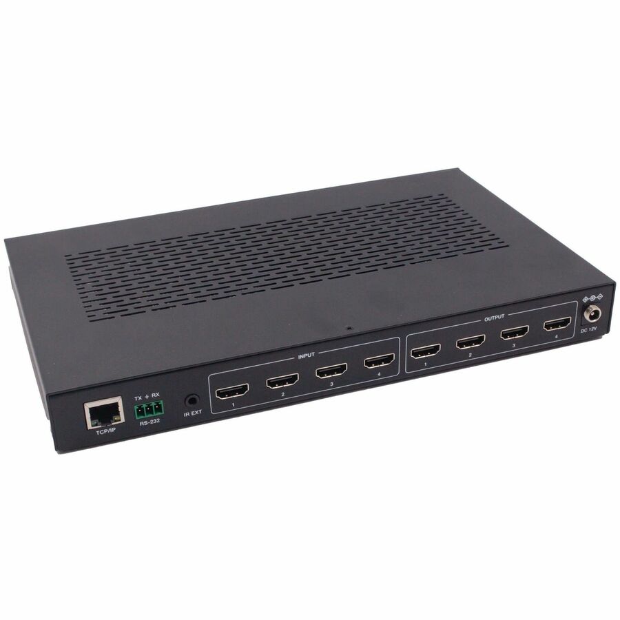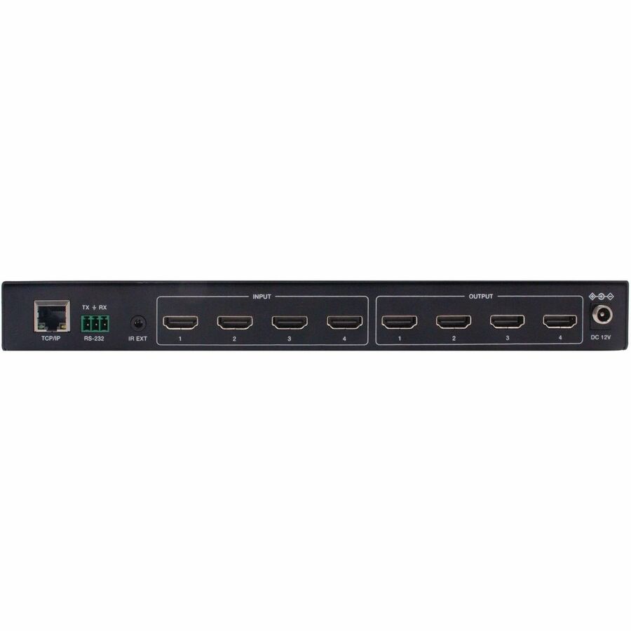 This Matrix Switch is a multi-purpose high-speed video processing system that you can configure for two different output modes: 4x4 matrix (with seamless switching) and video wall. It features four HDMI inputs with resolution up to 4K at 60 Hz and four HDMI outputs to create 10 video wall modes: 2x2, 1x2-2, 1x2, 2x1-2, 2x1, 1x3, 1x4, 3x1, and 4x1. You can set display modes via front-panel buttons, the included IR remote, RS-232 commands or TCP/IP. Access the web GUI to visualize content shared over multiple displays.