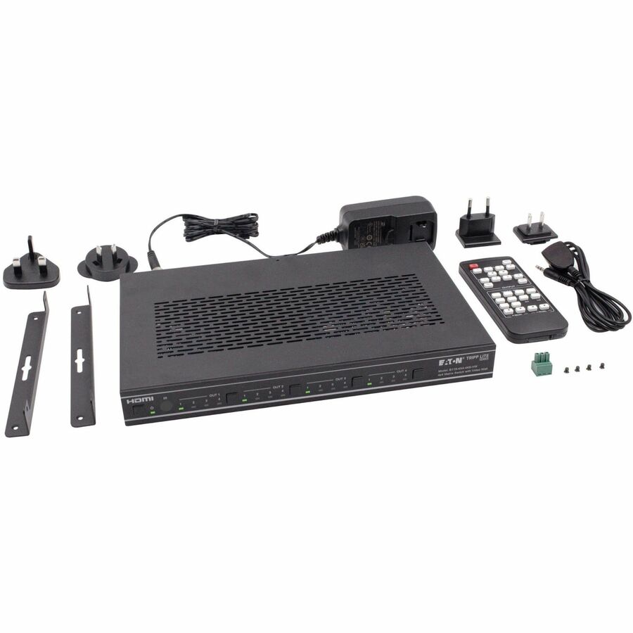 The unit works right out of the box with no software required. Mounting hardware is included for installing the units on a wall, under a desk or in a 19-inch rack. Connect up to four 4K source devices to the HDMI inputs and up to four 4K displays to the HDMI outputs with user-supplied cables. The external power supply comes with four international plug adapters to ensure an AC connection anywhere.