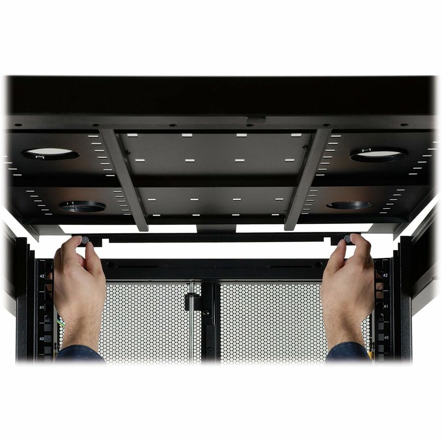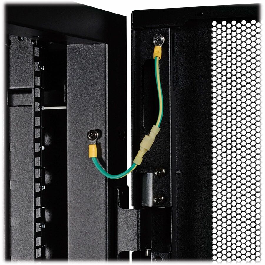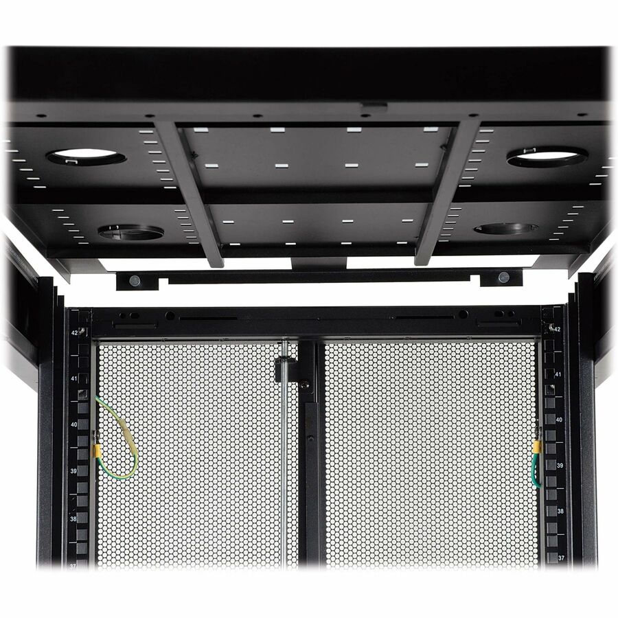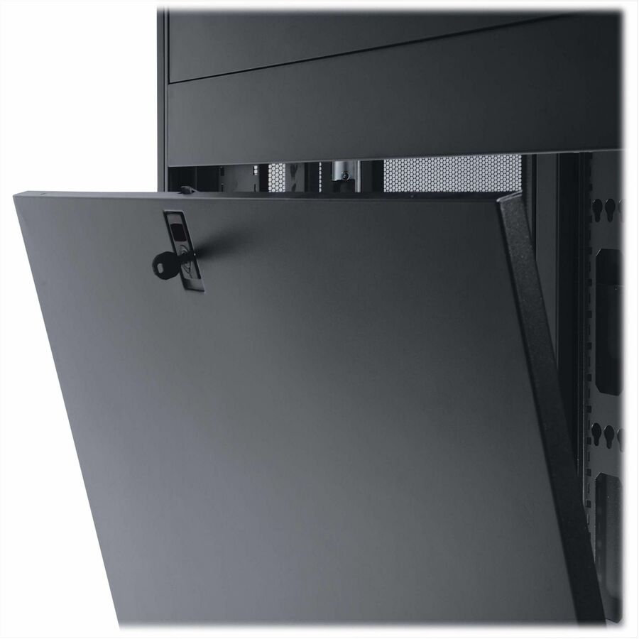 The reversible front door, split rear doors and half-size side panels lock securely with the included keys to help prevent damage, tampering or theft. The doors, side panels and roof panel are designed for quick release, making it simple to access connected equipment and cabling with little effort. The roof panel has strategically placed pass-throughs to accommodate cables from vertical 0U PDUs and other connected equipment. The perforated doors allow generous airflow from front to rear to keep your equipment cool and functioning at their peak.