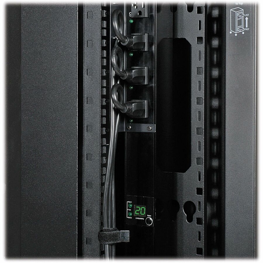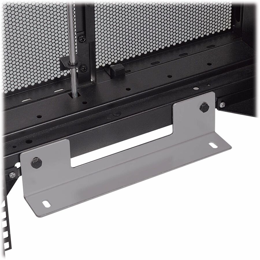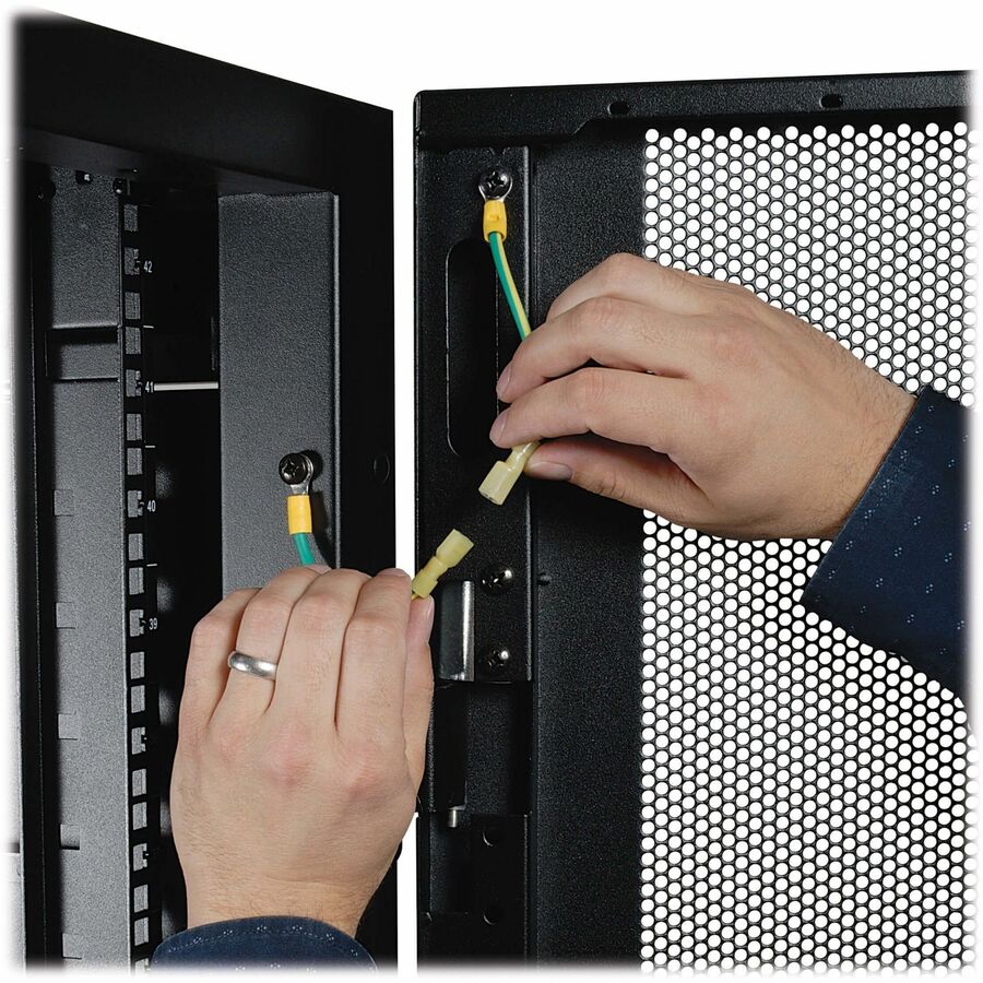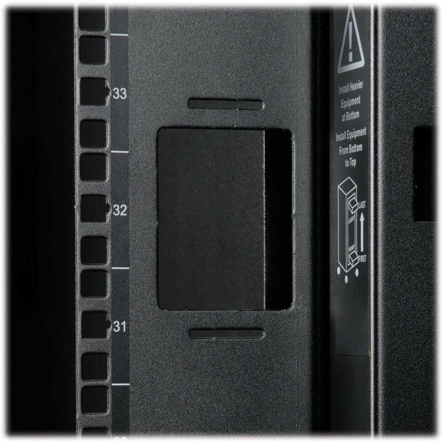 The reversible front door, split rear doors and half-size side panels lock securely with the included keys to help prevent damage, tampering or theft. The doors, side panels and roof panel are designed for quick release, making it simple to access connected equipment and cabling with little effort. The roof panel has strategically placed pass-throughs to accommodate cables from vertical 0U PDUs and other connected equipment. The perforated doors allow generous airflow from front to rear to keep your equipment cool and functioning at their peak.