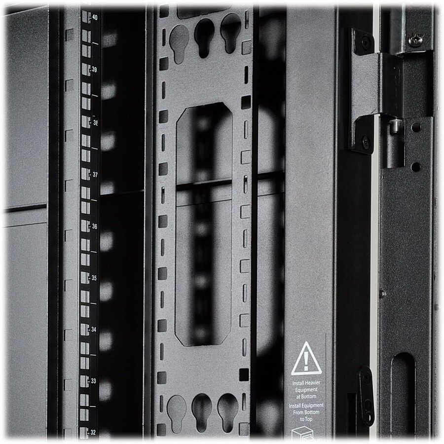 This 48U server rack comes fully assembled for quick deployment with pre-installed removable casters that let you maneuver it over a level surface and through a standard doorway into position, where it can be stabilized by adjusting the removable levelers. Toolless 0U mounting rails allow quick installation of compatible PDUs and vertical cable managers. Built-in baying brackets allow the combination of two or more rack cabinets in a row.