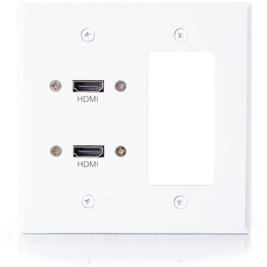 This wall plate is an ideal solution for installations which require the connection of two HDMI devices to a projector through in-wall cabling. This wall plate features flexible HDMI pigtails, making the installation of this wall plate in a wall box easier than wall plates that require use of standard HDMI cables. This wall plate is designed to work with standard wall boxes and the aluminum construction provides durability and a long life. The decorative cutout allows for the integration of a Controller or a USB extension soltuion.