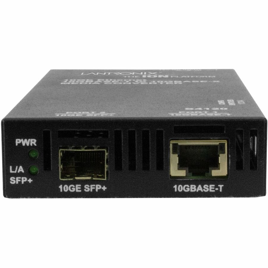 The S4120 is a stand-alone media converter that provides an interface between 10GBase-T ports and 10GBase-X slot via an open SFP+ port, allowing users to convert their 10Gig Ethernet ports to the preferred type of cabling used in their networks. The open SFP+ slot supports a wide variety of Transition Networks 10GE SFP+ fiber modules. Operating at Layer 1, the physical layer, data is passed through the converter at line speed, making the S4120 ideal for applications where low latency is essential. The ION S4120 can be managed, in-band, over the fiber, when it is linked back to a C4120 card installed in a managed ION chassis.