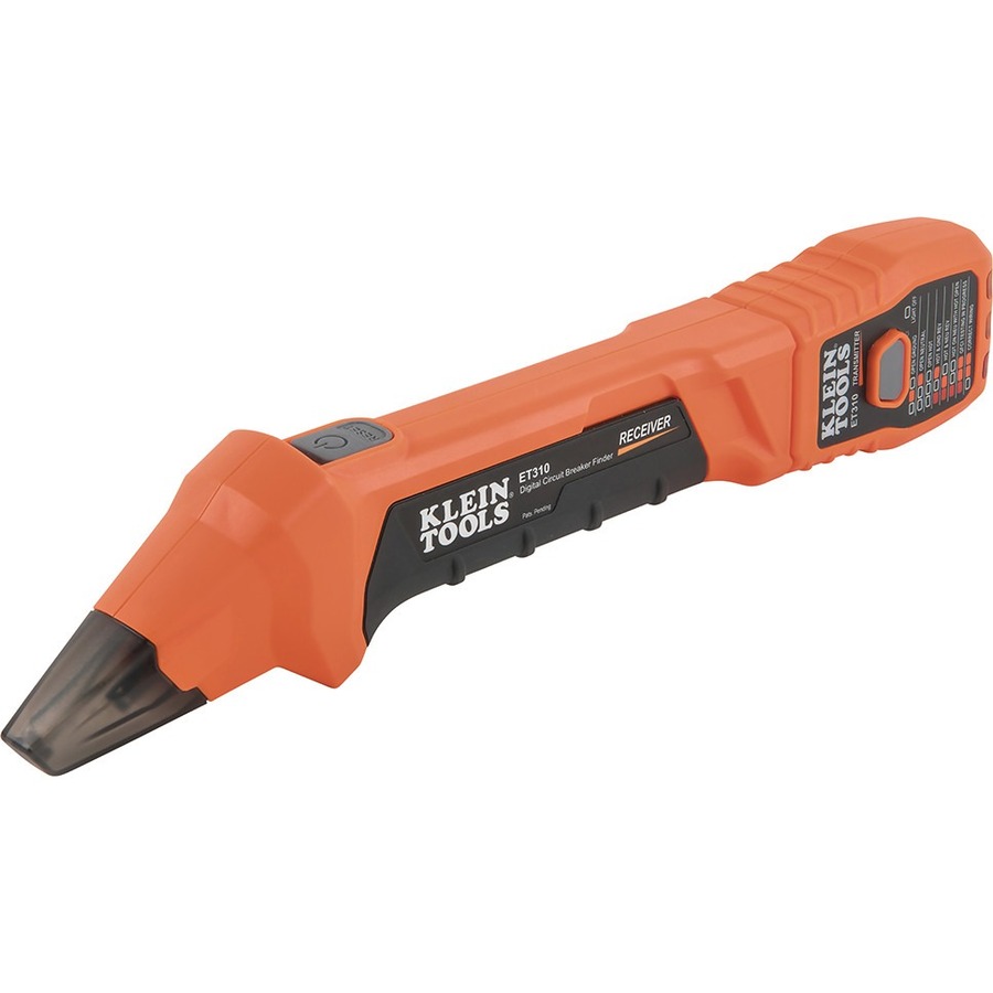 The Klein Tools ET310 Circuit Breaker Finder with Integrated GFCI Outlet Tester is a digital circuit breaker finder used to locate the correct circuit breaker in a panel to which an electrical outlet or fixture is connected. The Transmitter is connected to the electrical outlet or fixture in the circuit while the receiver is used to scan the breakers in the circuit panel. The Transmitter also features a GFCI outlet tester.